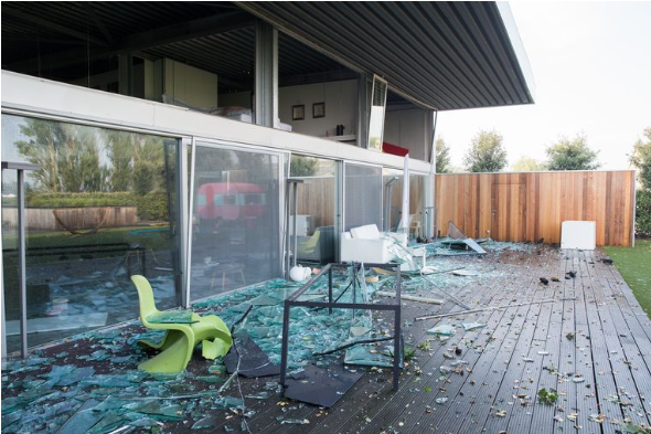 ----> "Om een idee te geven van de kracht: de voordeur die op slot was, is open gegooid, de deuren van de kasten in de hal hebben we teruggevonden op het terras, airco-units zijn uit de vergrendeling gerukt, door die gaten is veel water binnen gekomen."