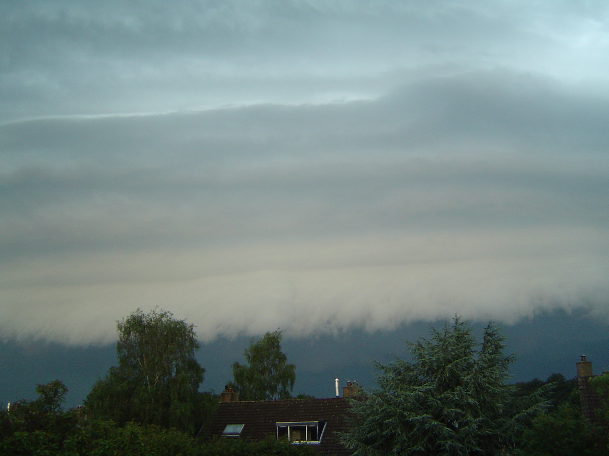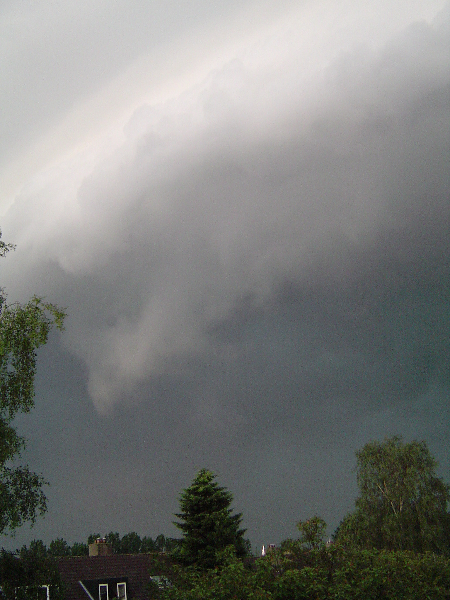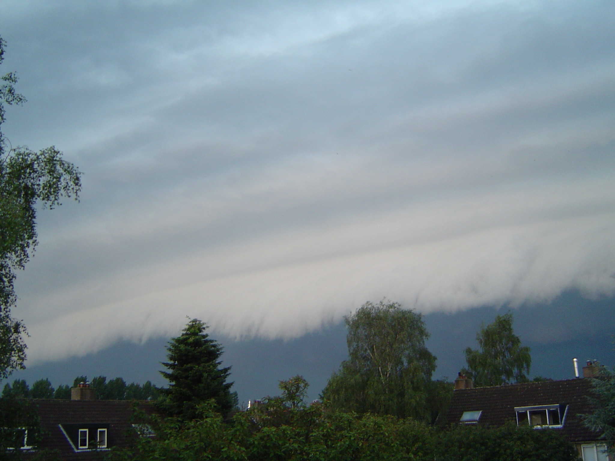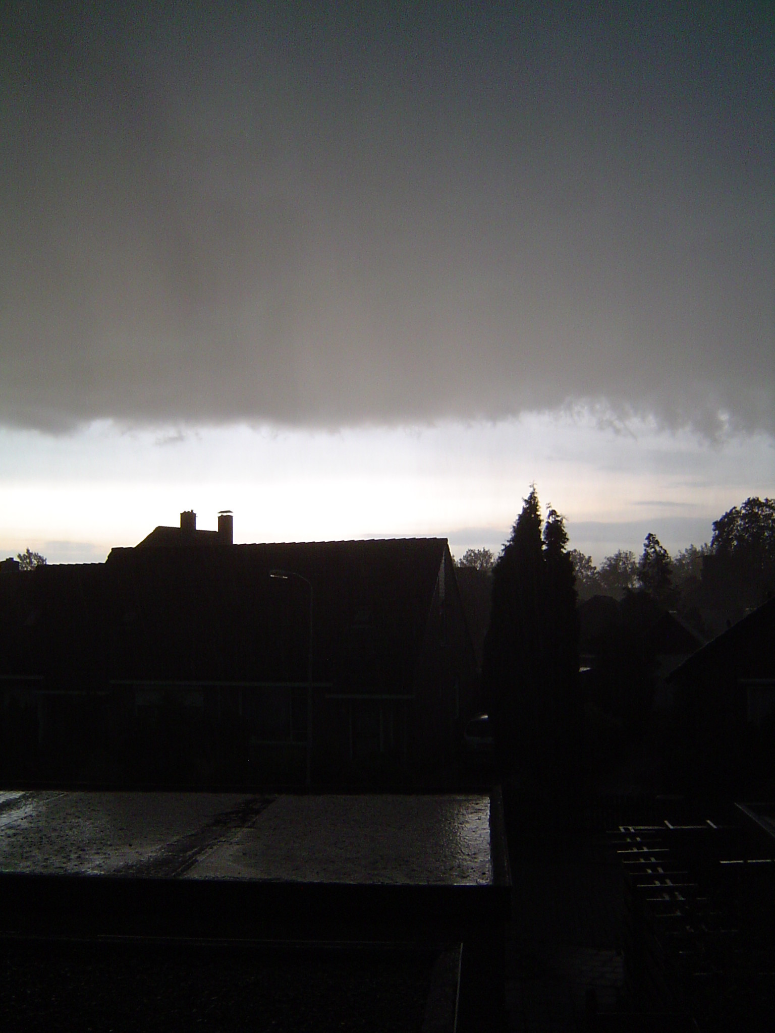 In een draadje een eindje hieronder, over onweer dat Lomm vaak mist / schampt, werd het noodweer van 17 juli 2004 aangestipt, dat toen eigenlijk het hele land (en ook Lomm) trof. Vervolgens ben ik even in mijn archief gedoken. Ik heb toen heel wat foto's geschoten van de naderende plankwolk, als ook van de wolkbreuk die daarna losbarstte. Zonder te overdrijven werd het zo donker als de nacht, wat de laatste foto's duidelijk laten zien. Eén foto heb ik later zeer sterk lichter gemaakt, waarna duidelijk is te zien hoe krom de bomen stonden vanwege de zeer zware windstoten. Een zeer memorabele weerdag!
