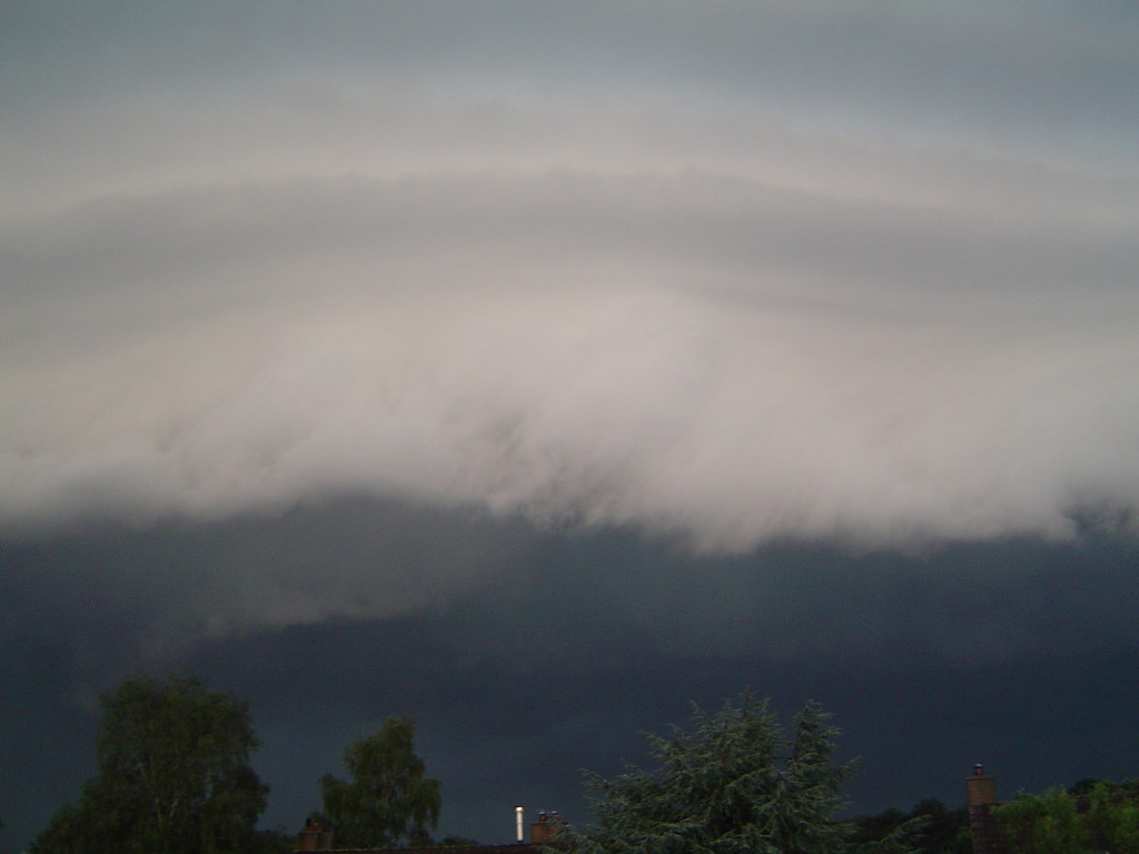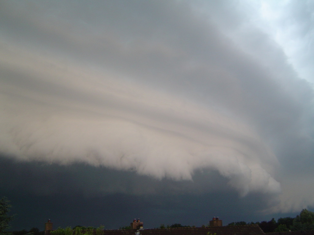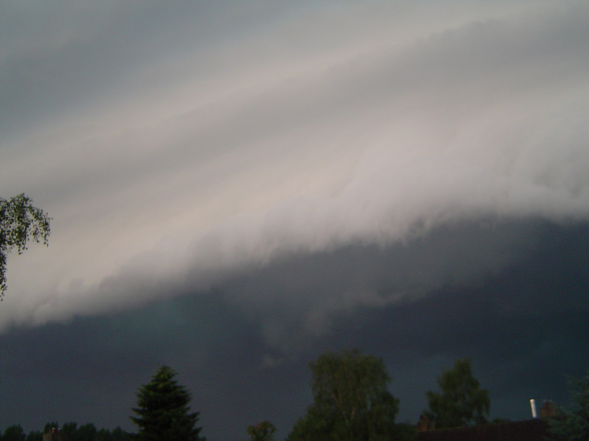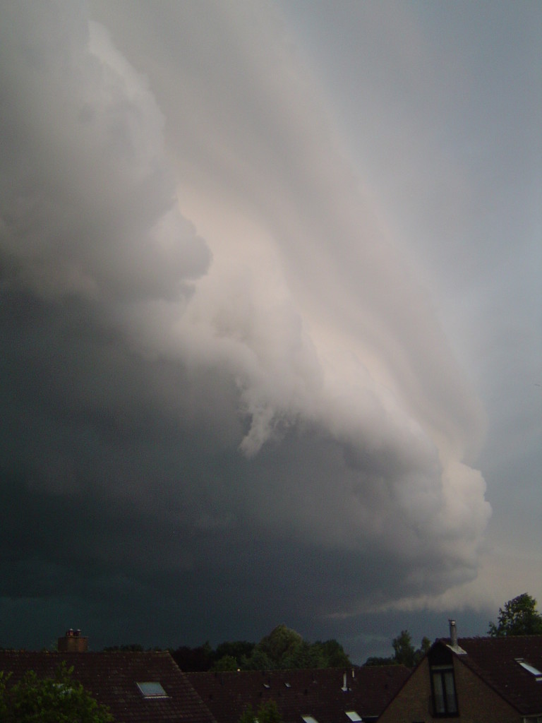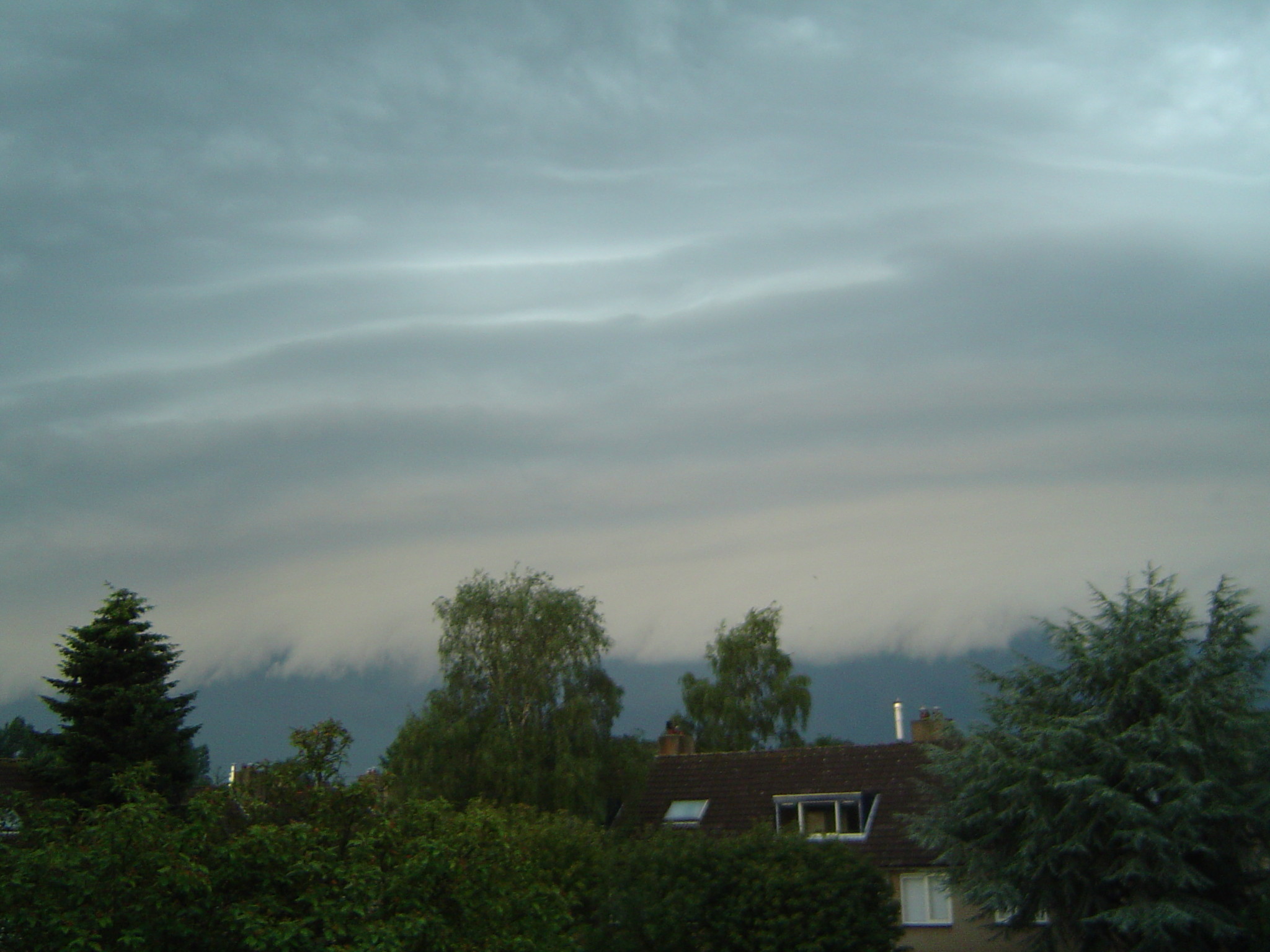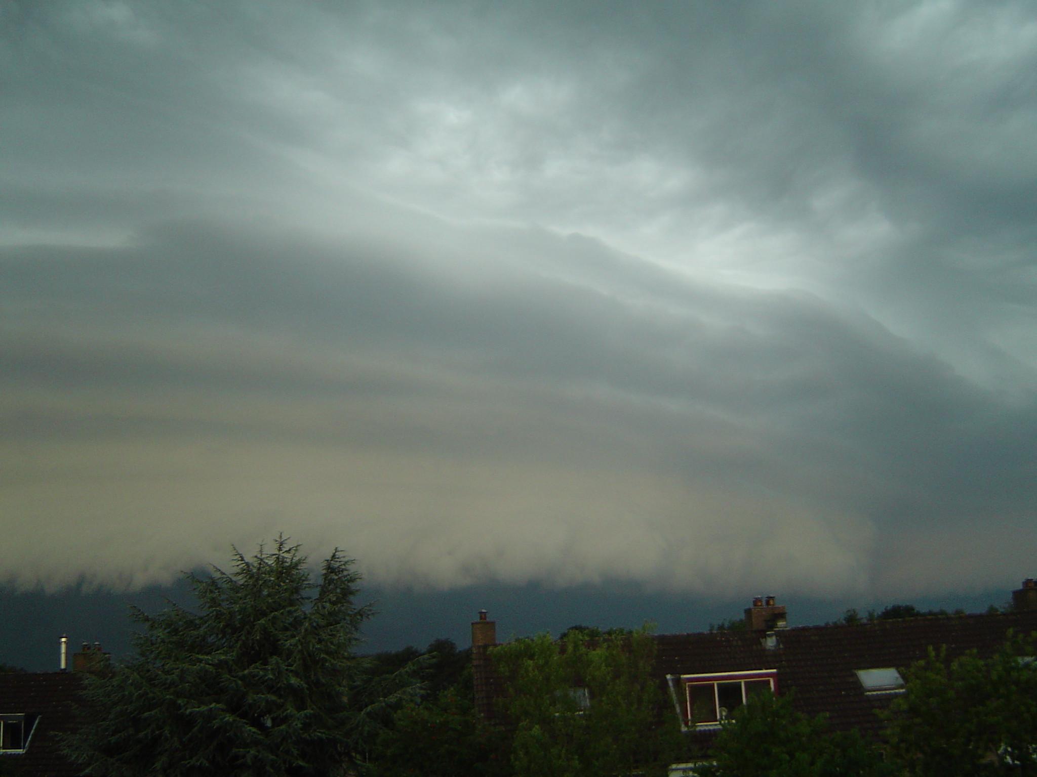 In een draadje een eindje hieronder, over onweer dat Lomm vaak mist / schampt, werd het noodweer van 17 juli 2004 aangestipt, dat toen eigenlijk het hele land (en ook Lomm) trof. Vervolgens ben ik even in mijn archief gedoken. Ik heb toen heel wat foto's geschoten van de naderende plankwolk, als ook van de wolkbreuk die daarna losbarstte. Zonder te overdrijven werd het zo donker als de nacht, wat de laatste foto's duidelijk laten zien. Eén foto heb ik later zeer sterk lichter gemaakt, waarna duidelijk is te zien hoe krom de bomen stonden vanwege de zeer zware windstoten. Een zeer memorabele weerdag!