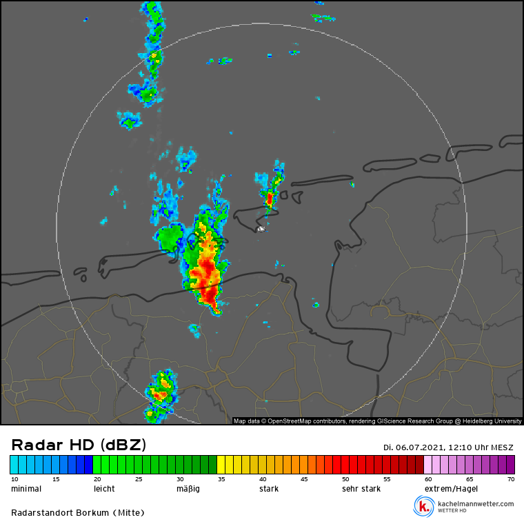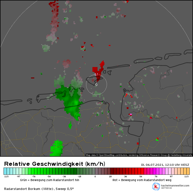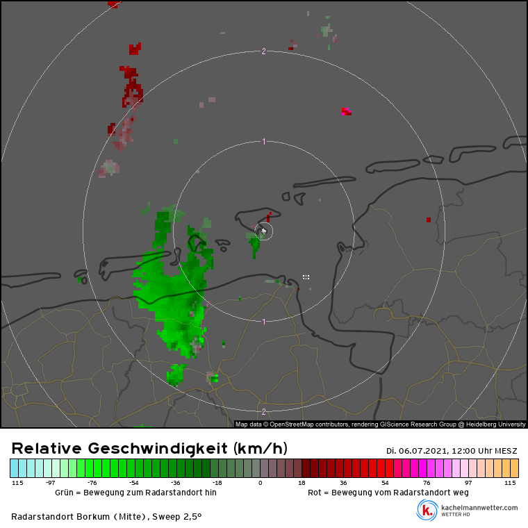 Norderney-doppler (via Kachelmann) levert meer suggestief bewijs, al is de (spatiale en temporale) resolutie niet genoeg om het volledige beeld te geven. Transient gedrag weerhoud ons ervan om een continue beeld te krijgen van de cyclische mesocycloontjes. De rotatie zat zoals vaker bij low-topped supercels in de onderste kilometers. Toch is de typische (RFD-)staart is zichtbaar op de dBZ-composiet, alsmede de rotatie op verschillende hoogten in de radiale snelheid.