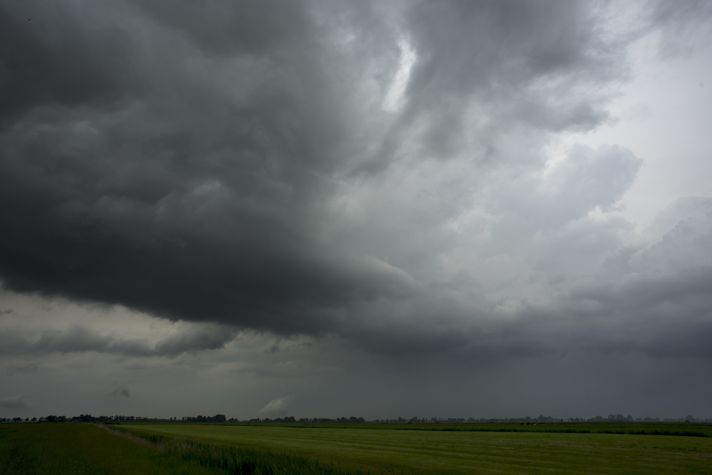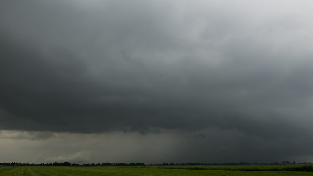 Aan het einde van de middag trok een zware bui over Groningen, met rond Onderdendam een (poging tot) hoos. Dat is in onderstaand filmpje niet zichtbaar, wel de roterende lucht. Het eerste stuk is pal achter de bui, het tweede wat later in dezelfde richting (NW) kijkende.