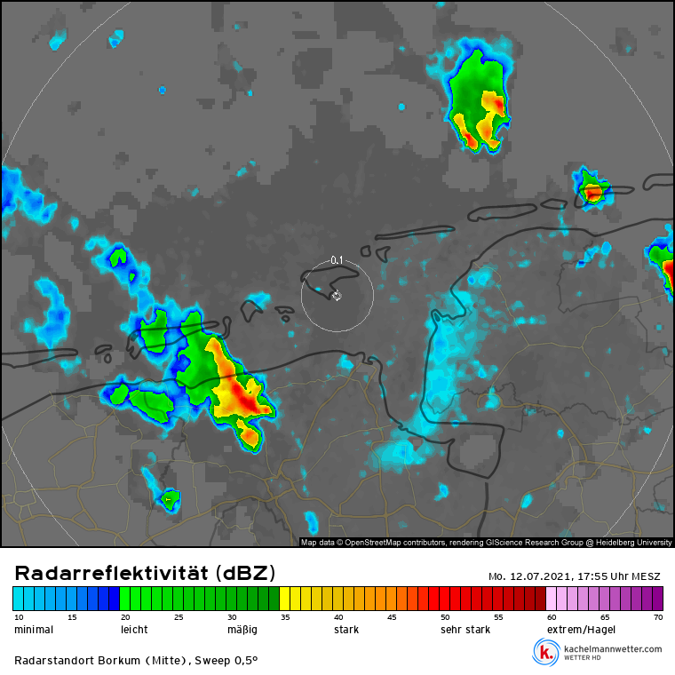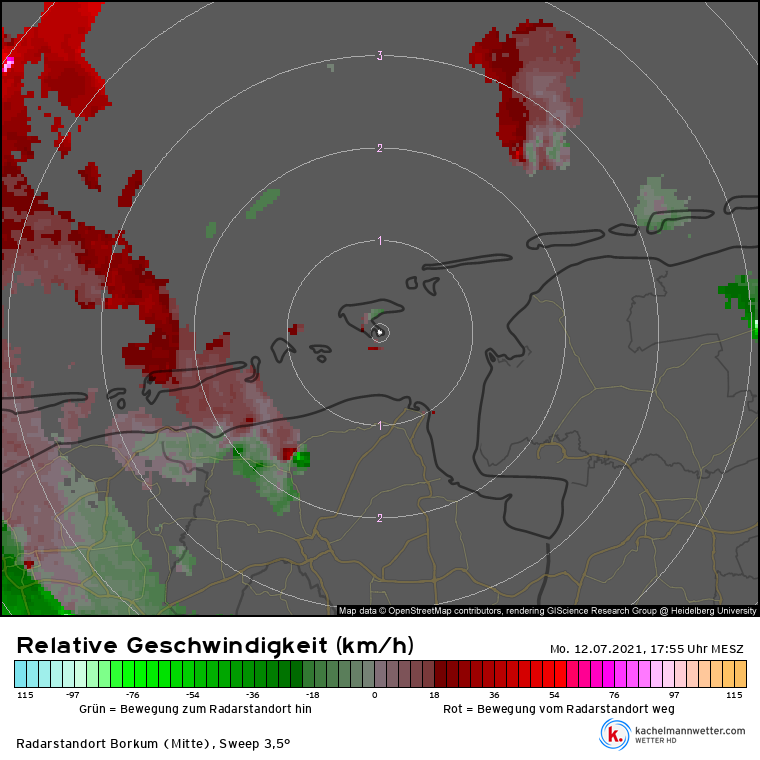 De radar bij Borkum geeft een prachtige TVS (tornado vortex signature = dipool op radiale snelheid) onder meerdere scanhoeken (tussen 0.5~3 km om 17:55). EDIT: Zie ook hoe dit correspondeerd met de "bal" aan het oostelijke uiteinde van het radarplaatje van reflectiviteit.