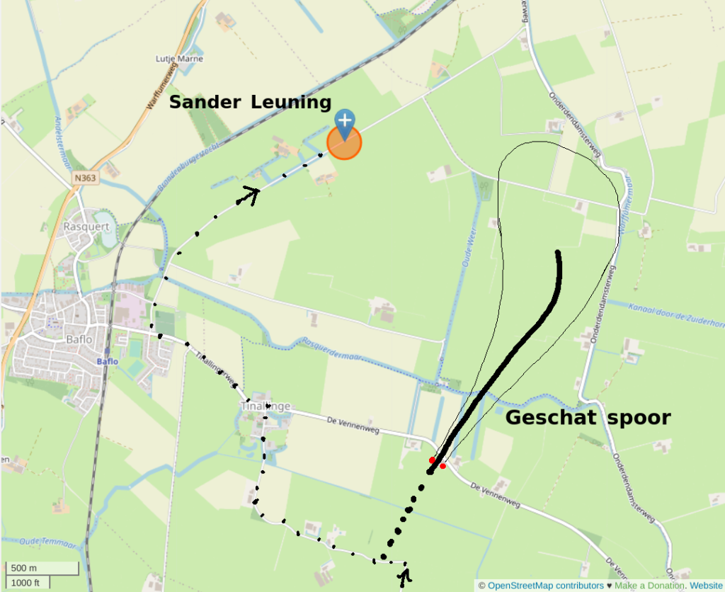 Vooral de weilanden en maisvelden (rode punten) rond Baflo zijn getroffen door een tornado (dikke lijn), gisteravond tussen 17:47-17:57. Ik heb heel dichtbij de initiele tornado-circulatie gestaan (in dikke stippellijnen), mogelijk al zo vroeg als 17:40. Ik moest verplaatsen door inkomende RFD (rear flank downdraught = 'neerslagkern' met mogelijk hagel). De route die ik aflegde tussen 17:40 en 17:45 heb ik met lichte stippeltjes aangegeven.
