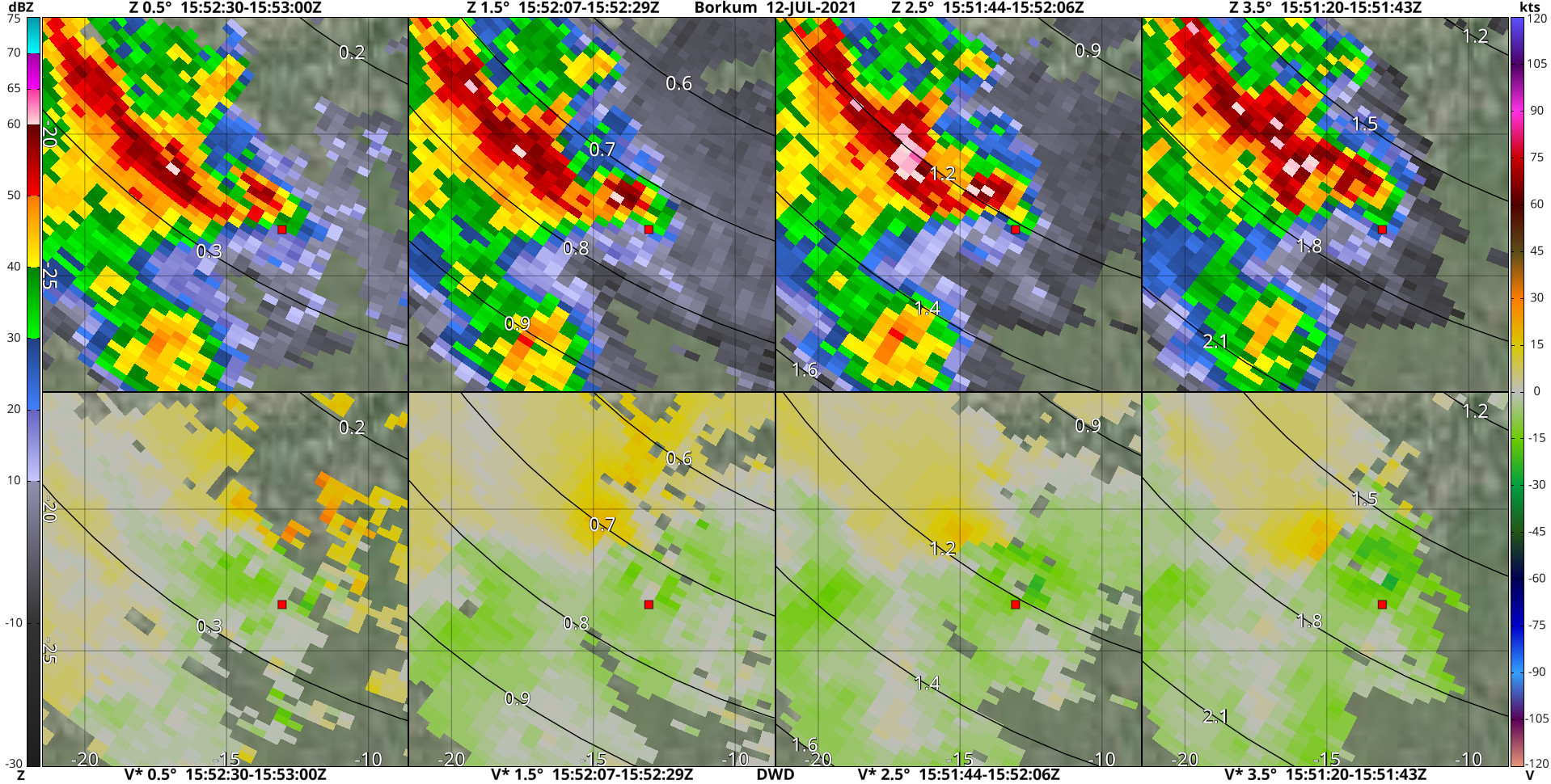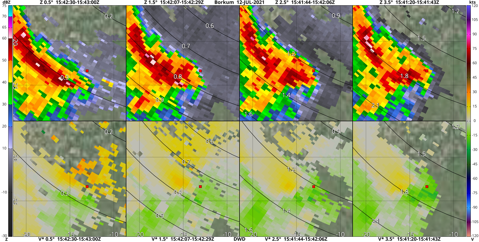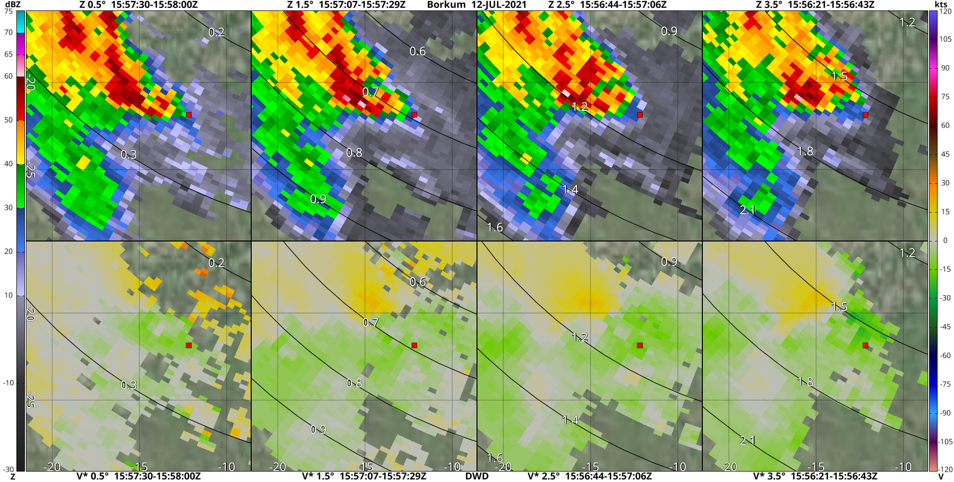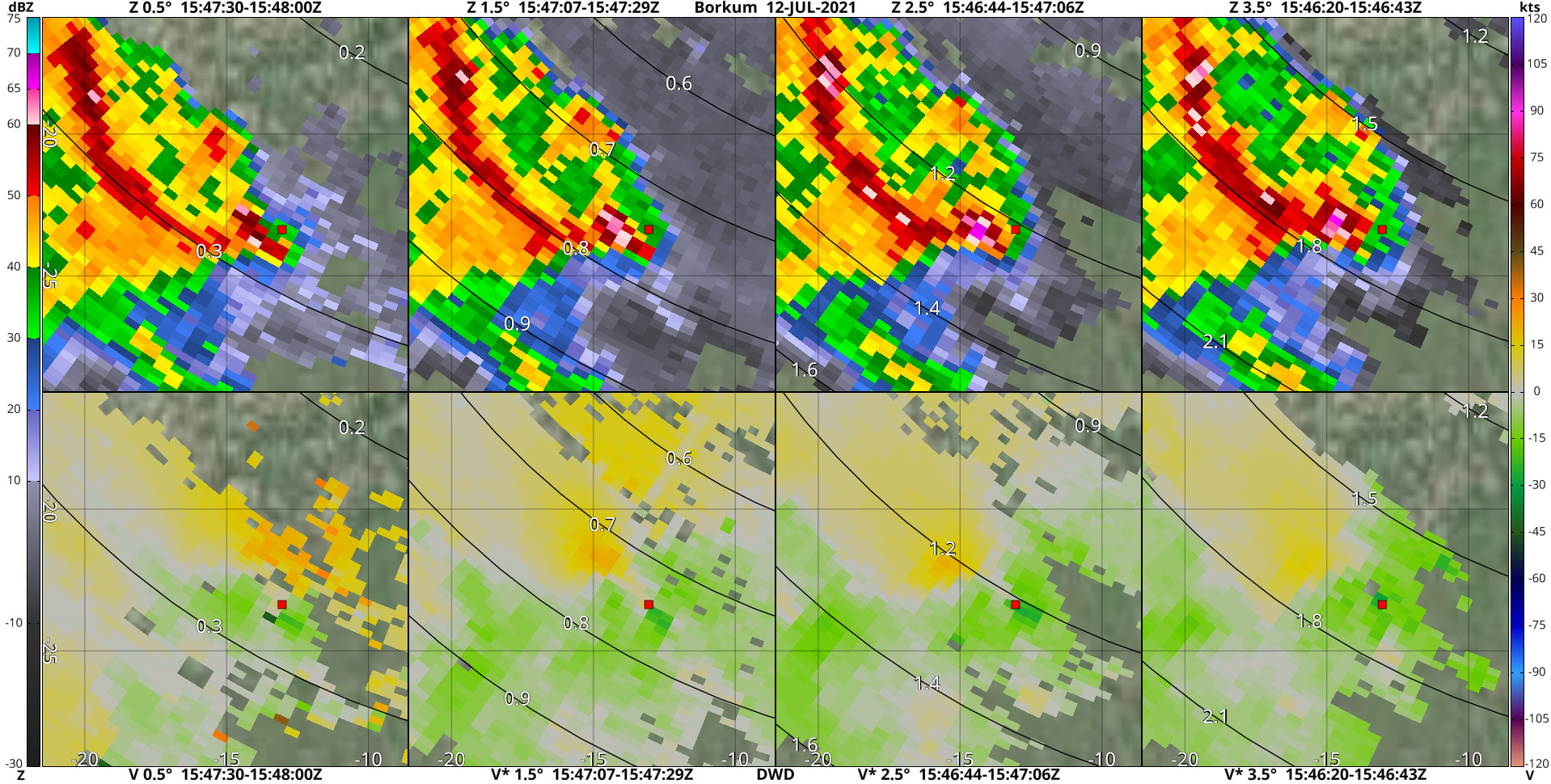Hier heb ik wat radarbeelden van Borkum met op afbeelding 1-4 de marker op de plek waar de dikke lijn begint op je kaart, en op afbeelding 5 en 6 de marker op de plek waar de dikke lijn eindigt. Je ziet mooi dat een compact coupletje precies over de marker op afbeelding 1-4 trekt. Dat verdwijnt dan vervolgens voordat de marker op afbeelding 5 en 6 bereikt wordt. Aangezien de tornado volgens jouw waarneming toen met de rope-out bezig was, was de circulatie toen denk ik te klein om nog gedetecteerd te worden.