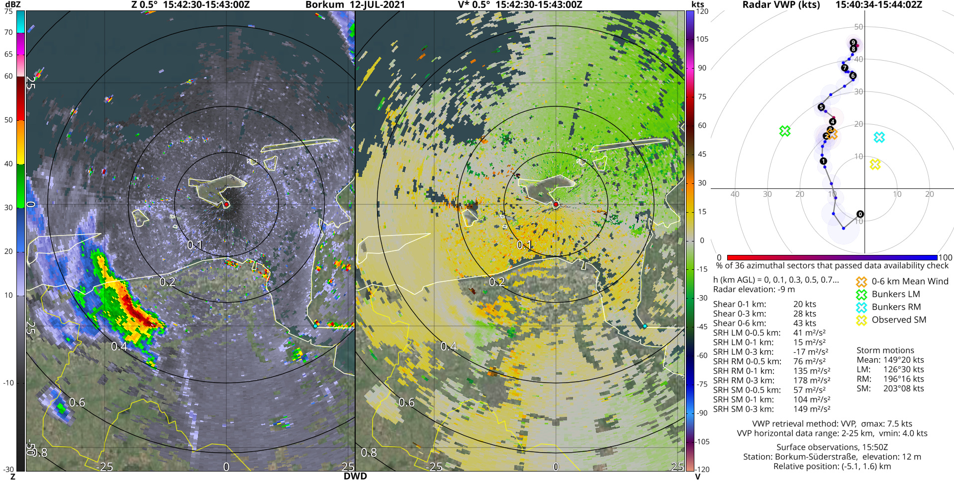 Onder deze 6 radarbeelden staan verder nog 2 animaties, die mooi de evolutie door de tijd heen laten zien. En daaronder staat nog een radarbeeld met daarnaast een van de radiale snelheid afgeleid hodogram voor Borkum (gele marker geeft uit radarbeelden bepaalde storm motion van de bui). Dat laat mooie kromming onderin zien, met SRH-waarden die gunstig zijn voor tornado's.