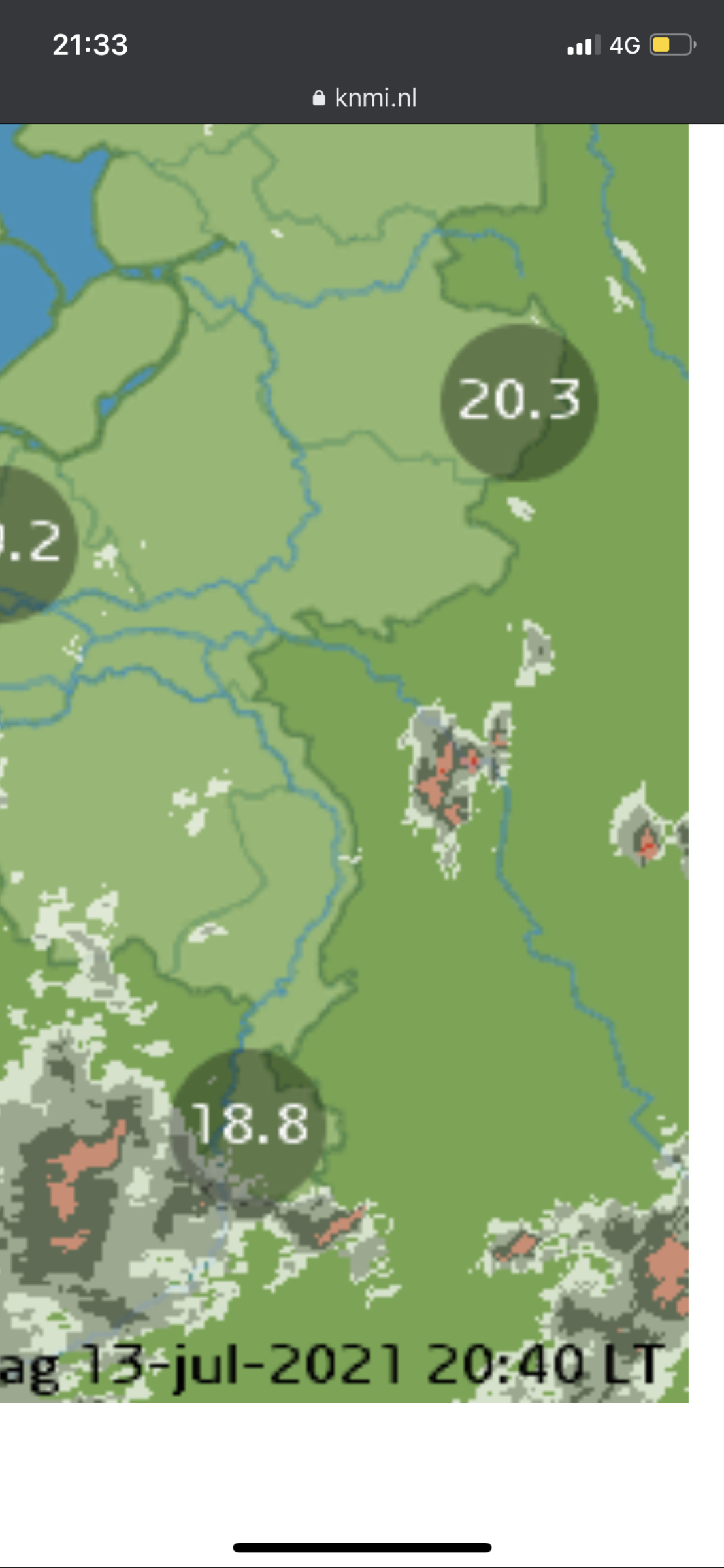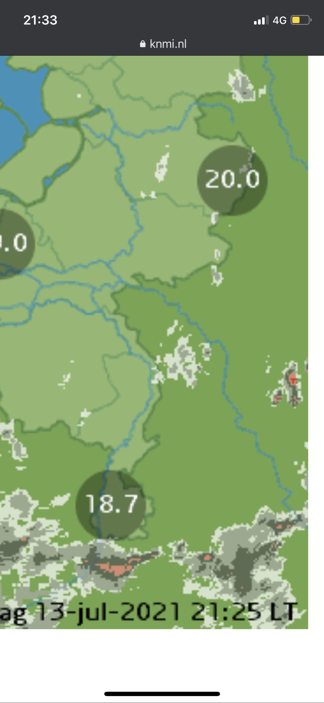 Kom maar lang. Maar ik zou niet teveel spectakel verwachten. De bui die hier eindelijk uit Duitsland is aangekomen is al weer boven de grens opgelost. Zie radarbeelden.