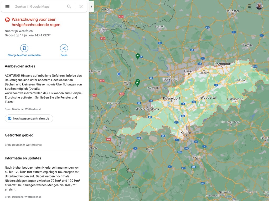 Niet eerder gezien in Google Maps. Hagen, net onder Dortmund, zit al op 182mm regen sinds middernacht. Echt niet te geloven.