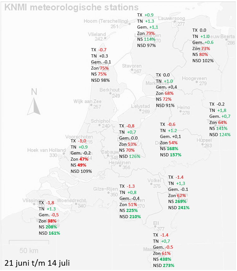 En dan het plaatje van de eerste helft van de zomer. De ongelijke verdeling van de tweede fase van de zomer heeft ook zijn weerslag op dit beeld. In het noord(oosten) van het land presteert de zomer voorlopig duidelijk boven normaal: relatief veel zon en weinig neerslagduur ten opzicht van het langjarige gemiddelde, met qua temperatuur de grootste positieve afwijkingen in de maxima. Hoe verder je richting het zuid(west)en gaat, hoe meer dit beeld veranderd. In het zuidwesten presteert de zomer in totaliteit inmiddels iets onder normaal, geredeneerd vanuit het weerbeeld. Ook al ligt de gemiddelde temperatuur ook hier boven normaal.