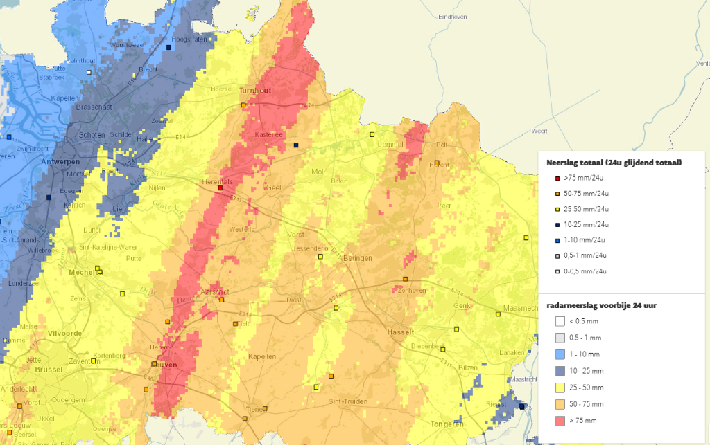Ten oost van de lijn Turnhout - Herentals viel er lokaal +75mm.