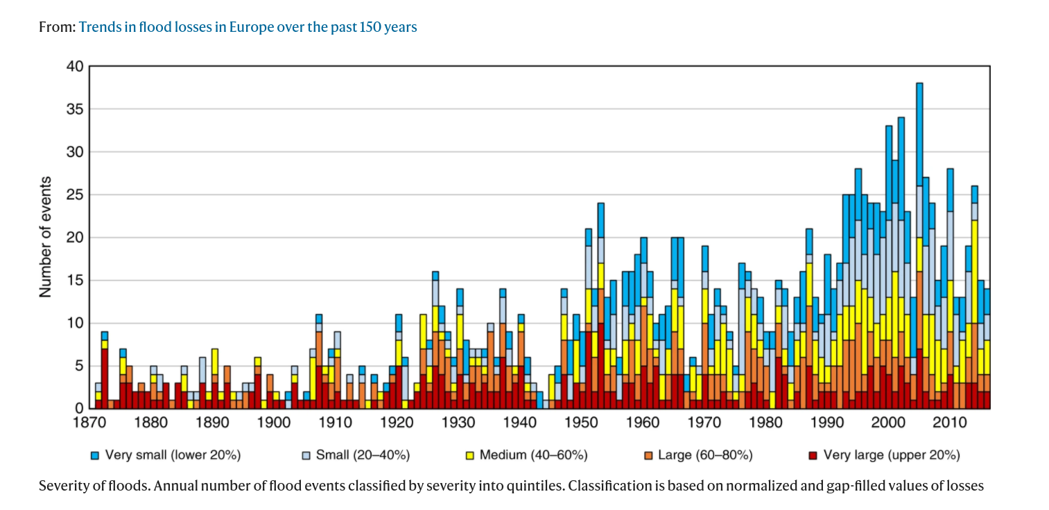 Om iets te kunnen zeggen over overstromingen veroorzaakt door regenval: er is in 2020 een artikel verschenen waarin de conclusie getrokken wordt dat: "Overall, both short- and long-duration extreme precipitation events have become more intense in a majority of records within the Central European region considered. ":