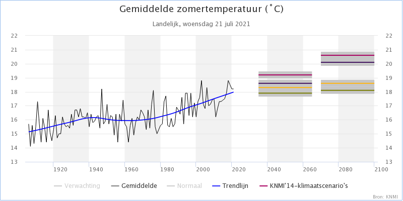 Volgens het warmste scenario* (WH) is de gemiddelde zomertemperatuur rond 2050 al opgelopen naar 19,2 graden. Dat zou dus betekenen dat een gemiddelde zomer over zo'n 30 jaar warmer is dan de zomers van 2003 en 2018. Gezien de huidige trendlijn lijken de twee koelste scenario's al niet meer haalbaar, behalve als er plotseling weer een daling zou in worden gezet.