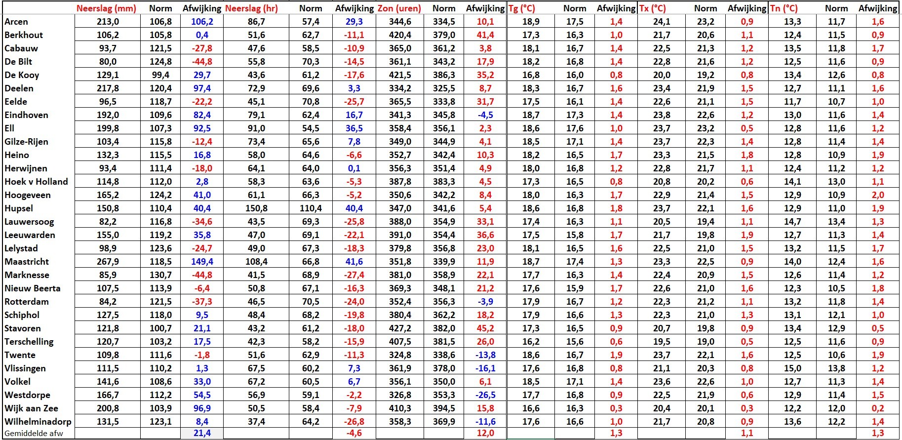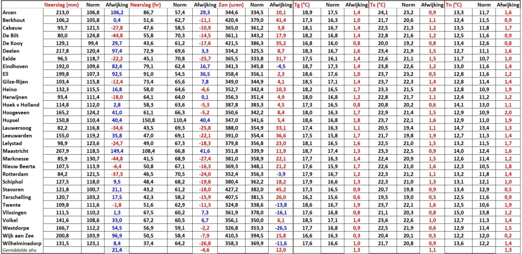 De zomer is op de meeste plaatsen nat. Natste plaats is Maastricht met een afwijking van 149,4 mm.