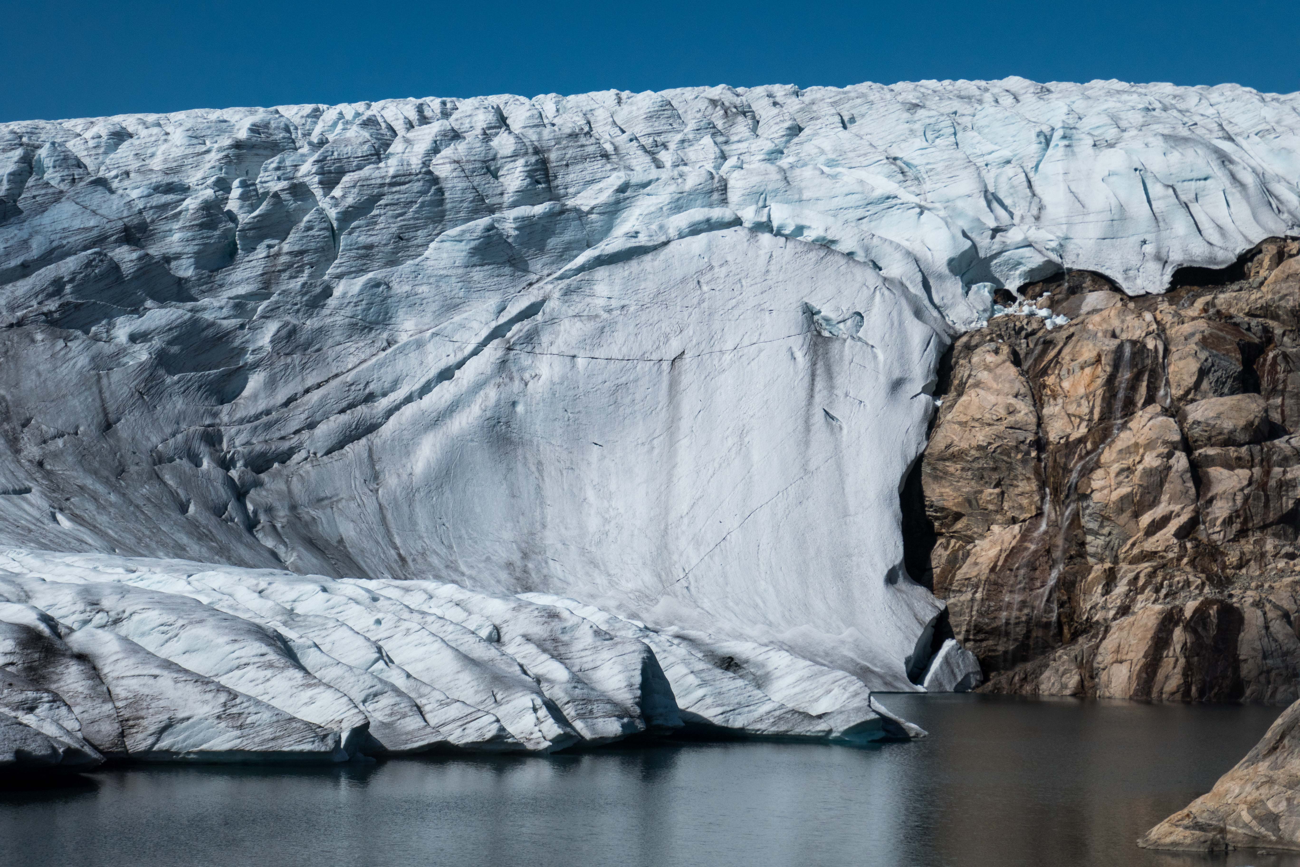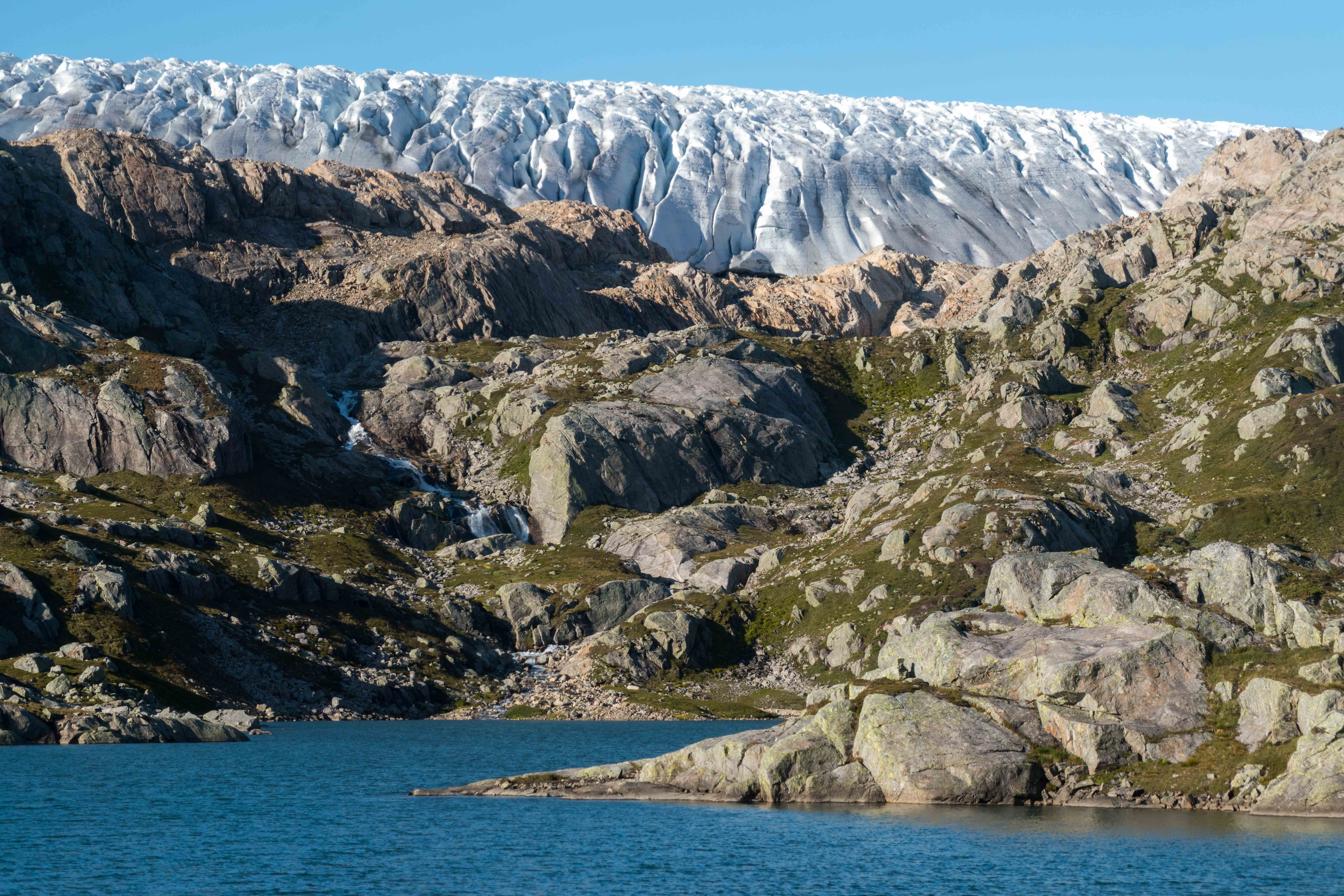 Ik nam onbedoeld de kortste omweg. Daardoor kwam ik iets te hoog uit en moest onnodig steil afdalen. Allemaal niet erg handig, maar gelukkig was het strakblauw en had ik de hele dag. Bovendien leverde deze toeristische route een mooi uitzicht over de schier oneindige ijskap op. Er ligt vrijwel geen sneeuw meer op, wat betekent dat de ijskap dit jaar veel ijs verliest.