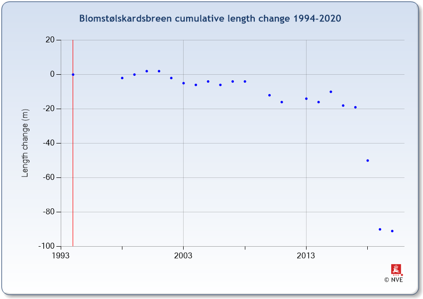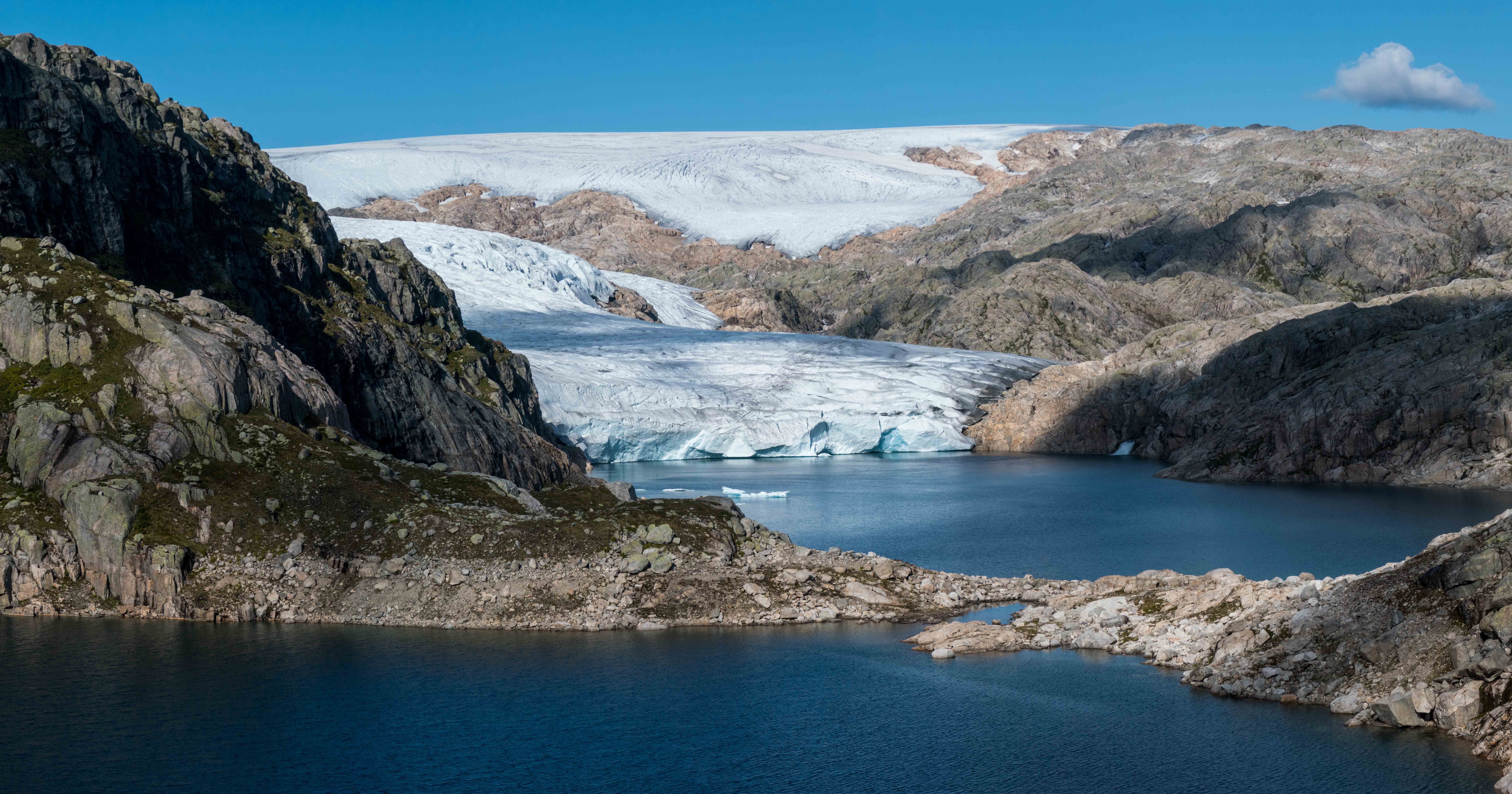 Dat klopt ook beter met de lengte van de gletsjer, die over de genoemde periode min of meer stabiel is gebleven. Na 2017 is dat snel veranderd en is Blomstølskarsbreen in twee jaar tijd zeventig meter korter geworden. Nog steeds heel weinig in vergelijking met andere gletsjers in Noorwegen en Europa. Bovendien was 2019-2020 een sneeuwrijk jaar en is de gletsjer niet korter geworden. Dat is dus wel een bezoekje waard!