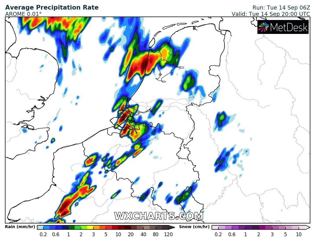 Arome laat voor vanavond fikse buien zien voor noordwest Nederland.