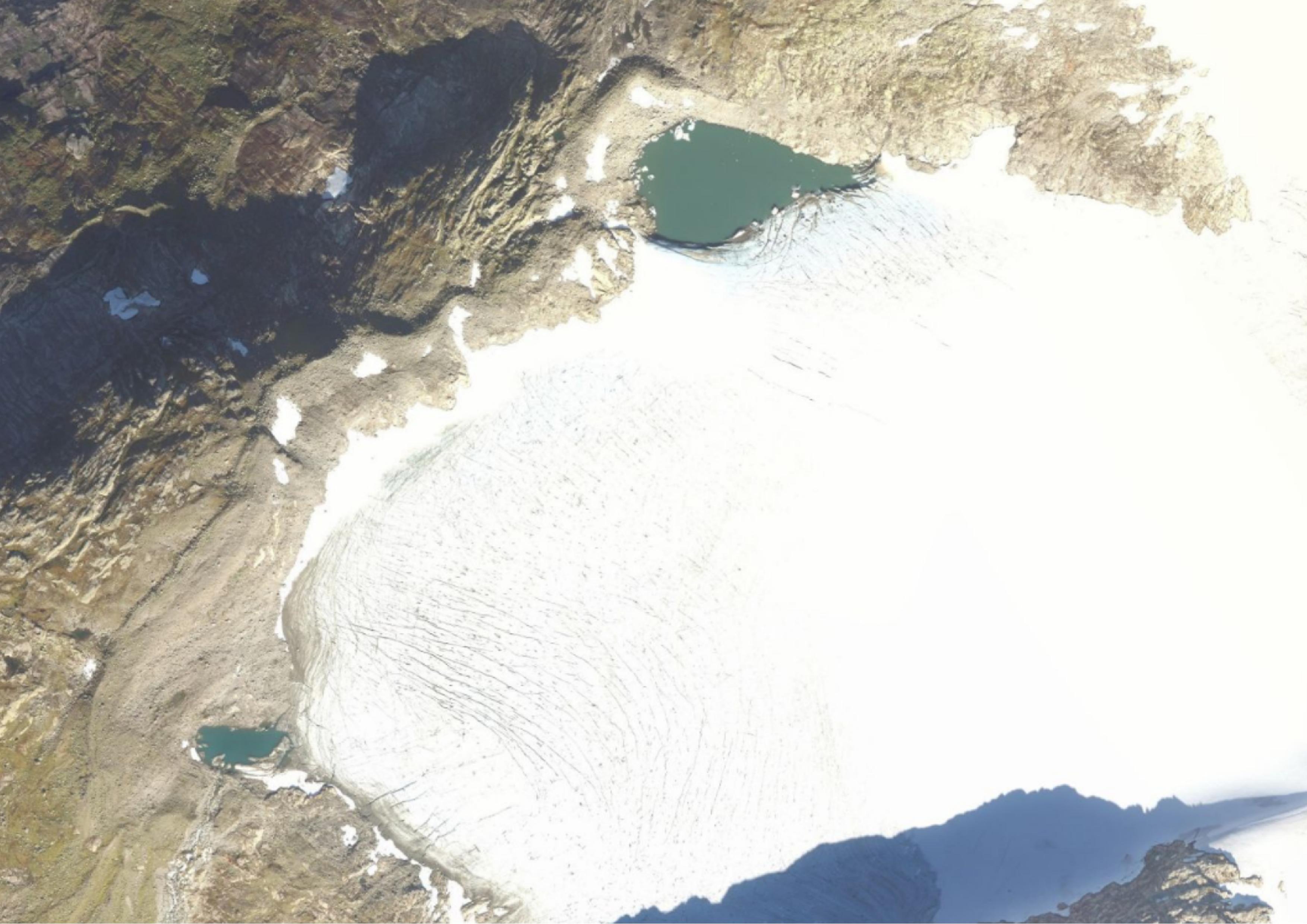 Luchtfoto van Marabreen uit 2017, met aan de linkerkant de zijmoraine op korte afstand van het ijs en bovenin het ijsbergmeertje. Bron: https://www.norgeibilder.no/.