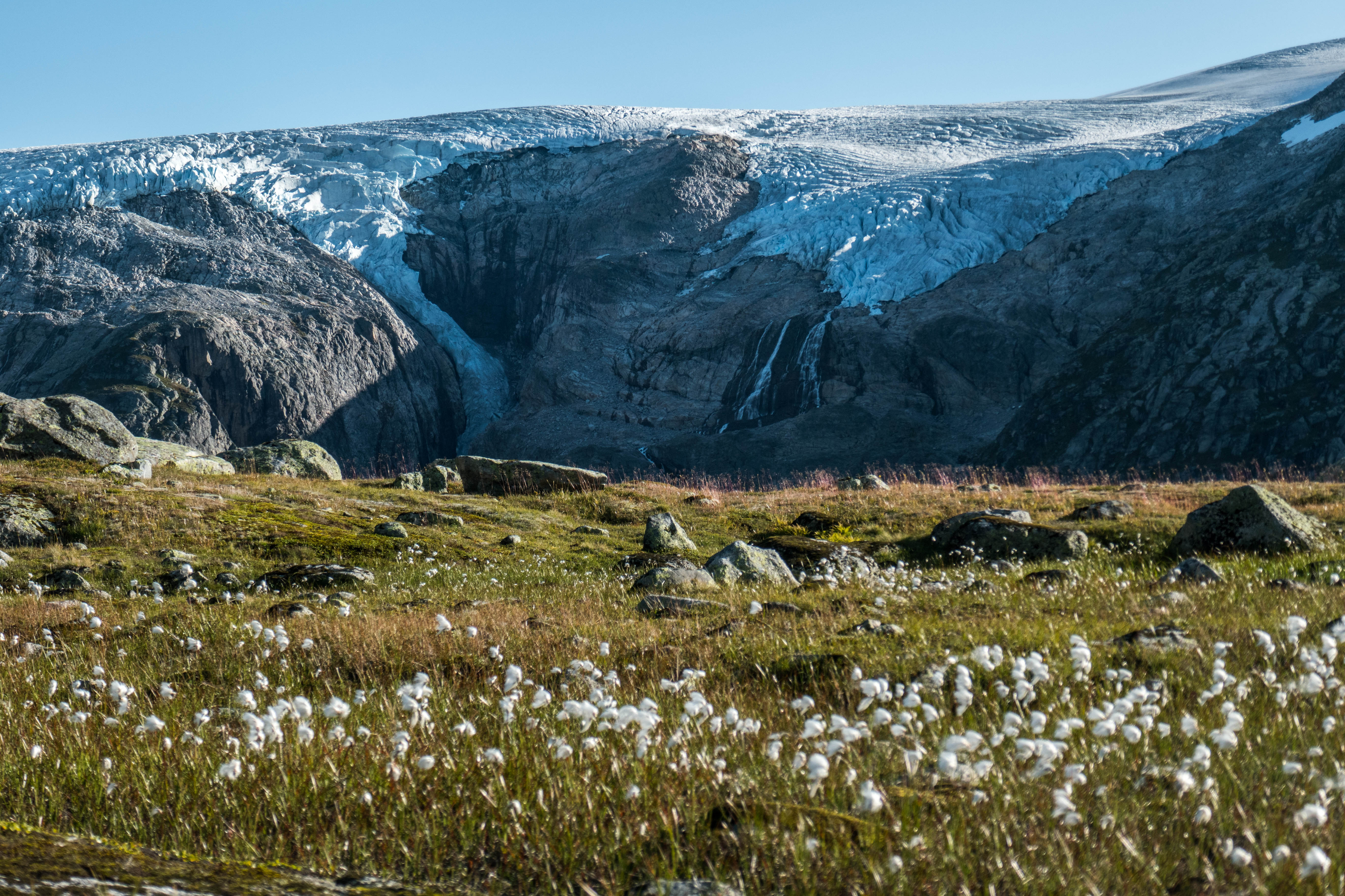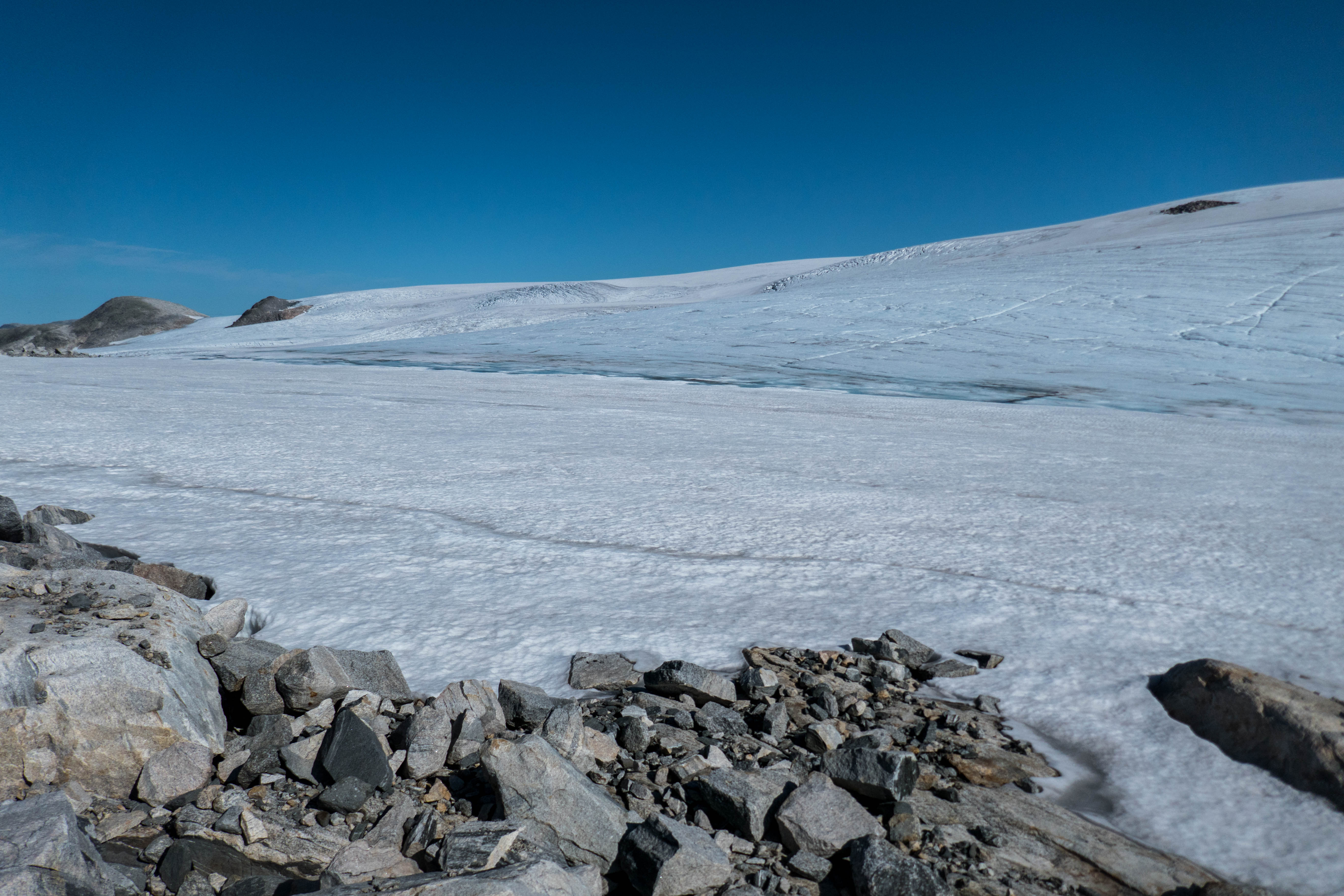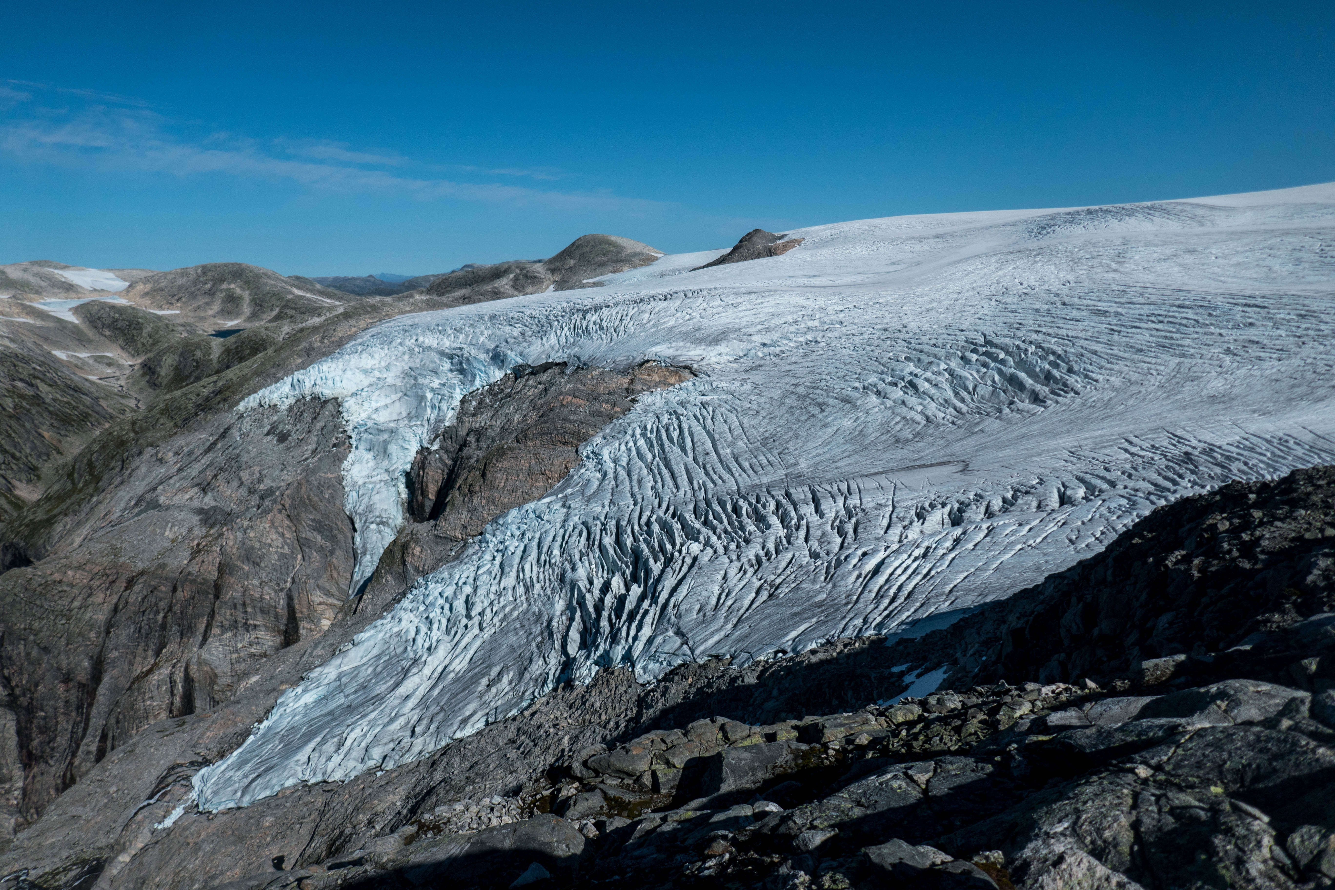 Foto: de slechts deels met (overjarige) sneeuw bedekte Jostedalsbreen tussen 1500 en 1650 meter.