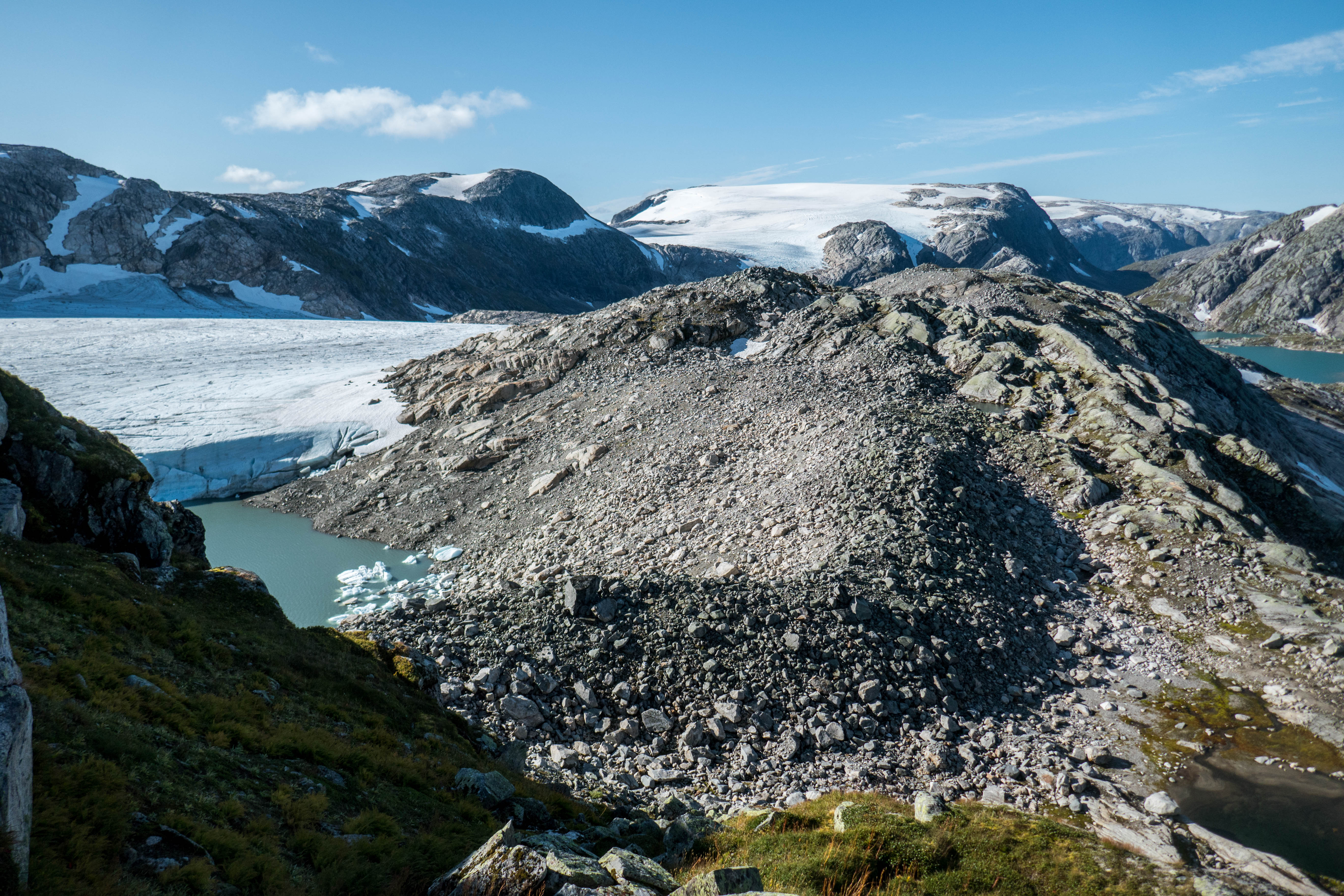Vanaf het meertje kun je de Tverrfjellet oplopen. Er is geen pad, maar de helling is goed begaanbaar. Achteromkijkend zie je heel duidelijk hoe de zijmoraine van Marabreen loopt. Die komt uit de tijd dat de gletsjer nog wat groter was, grofweg begin 20e eeuw.