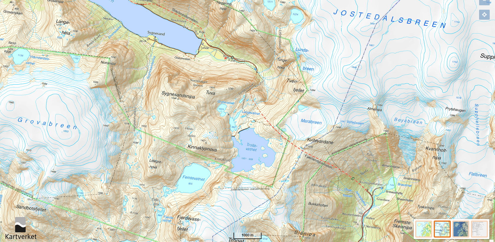 Kaart: Marabreen en Lundabreen in het zuiden van Jostedalsbreen. Norgeskart.no