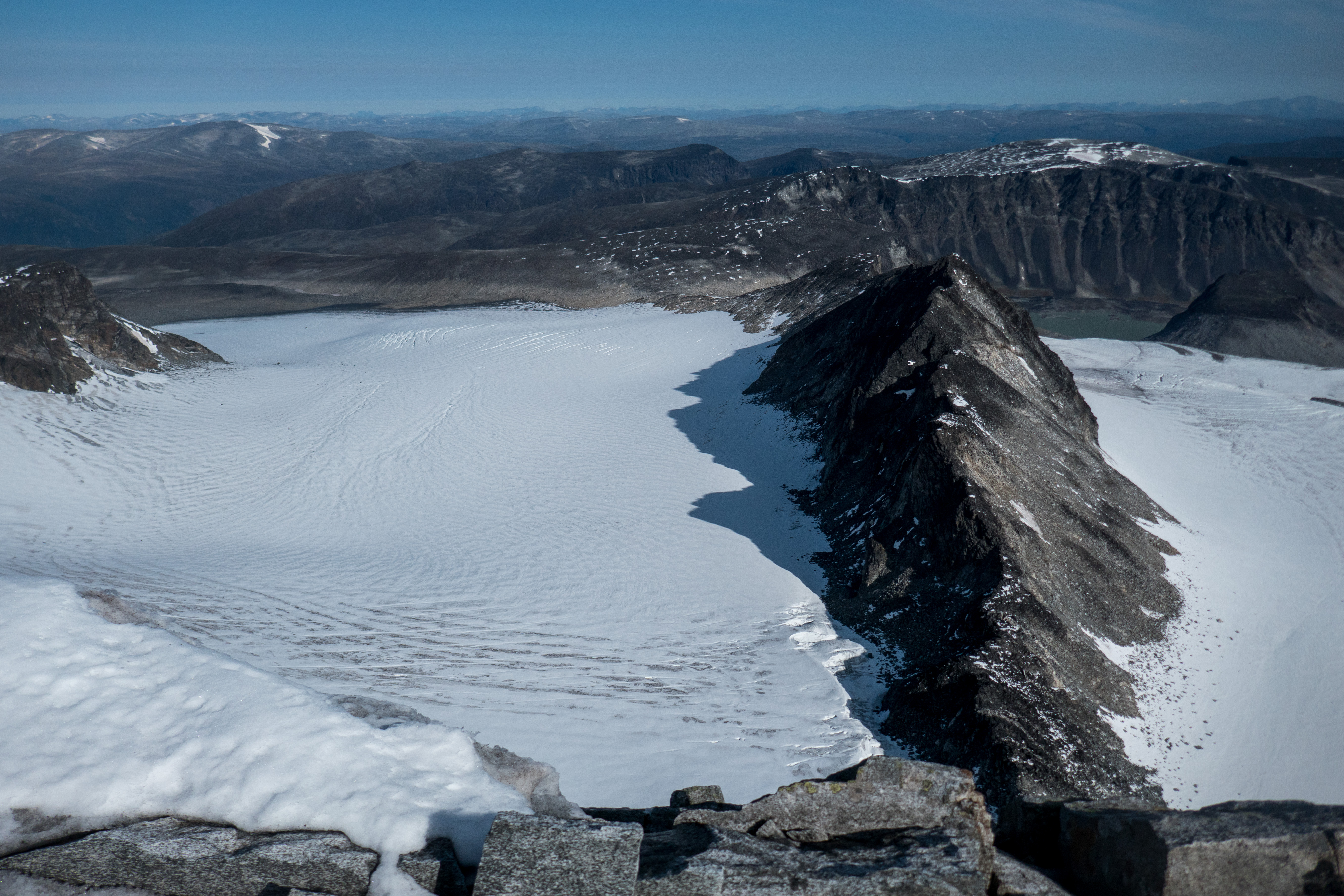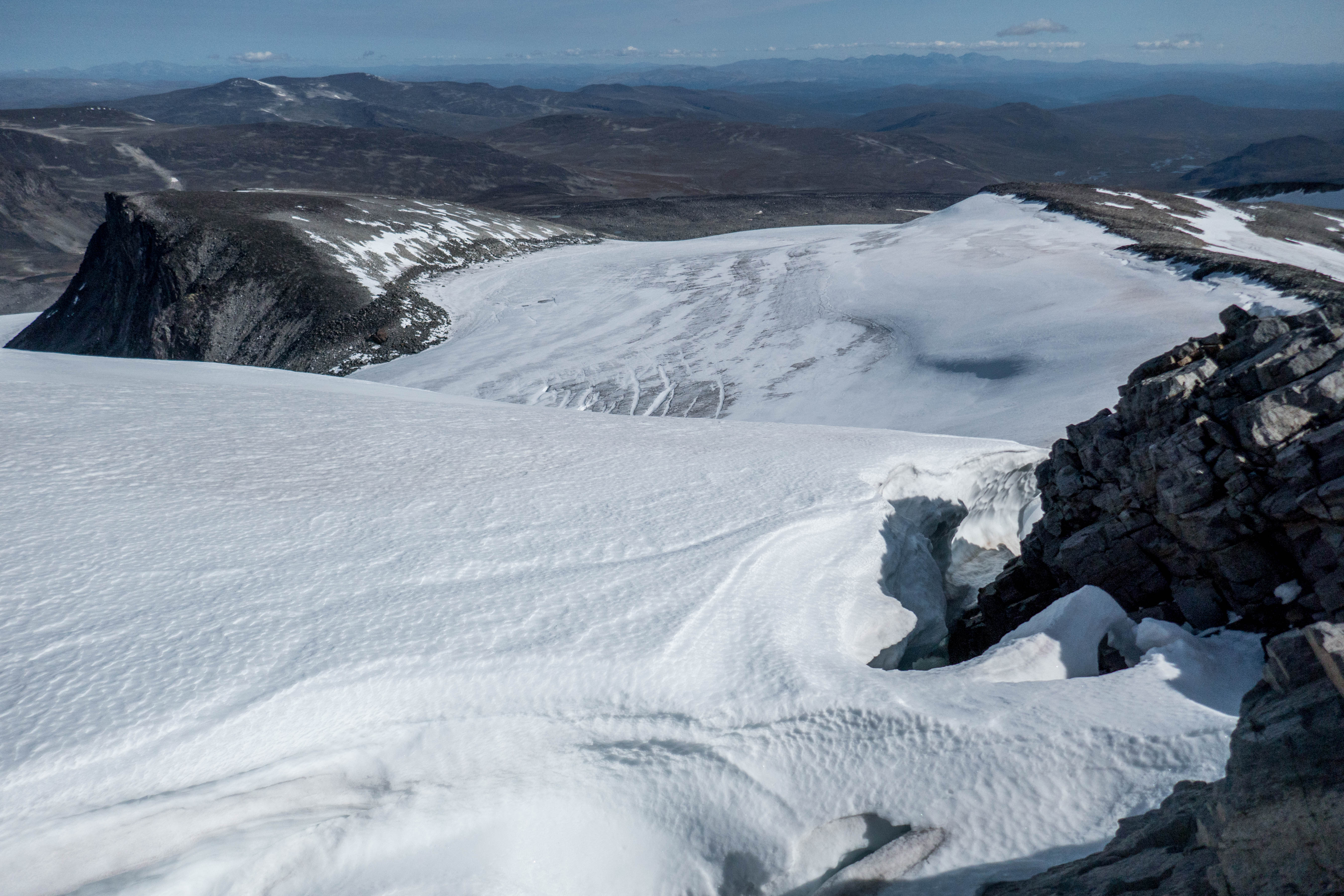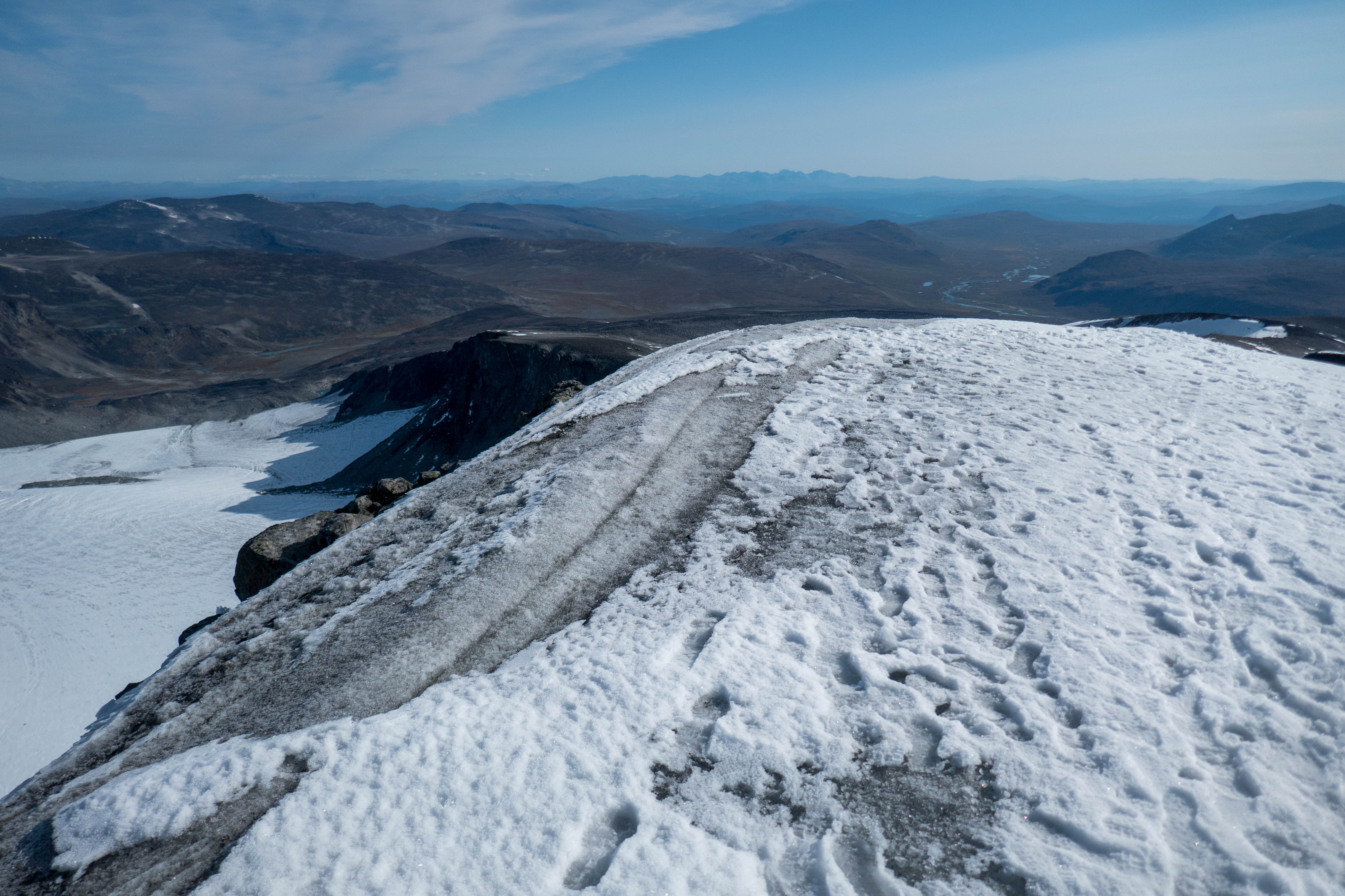 Op de bijna ijsvrije top zelf wordt plotseling Grotbrean zichtbaar. De twee armen van die gletsjer beginnen pal onder de top, waar de sneeuw veilig in de schaduw van een tweehonderd meter hoge verticale afgrond ligt. Dat het ijs er zo mooi wit bij ligt komt door het verse laagje sneeuw dat een paar dagen eerder was gevallen en in de late augustuszon maar moeizaam smolt.