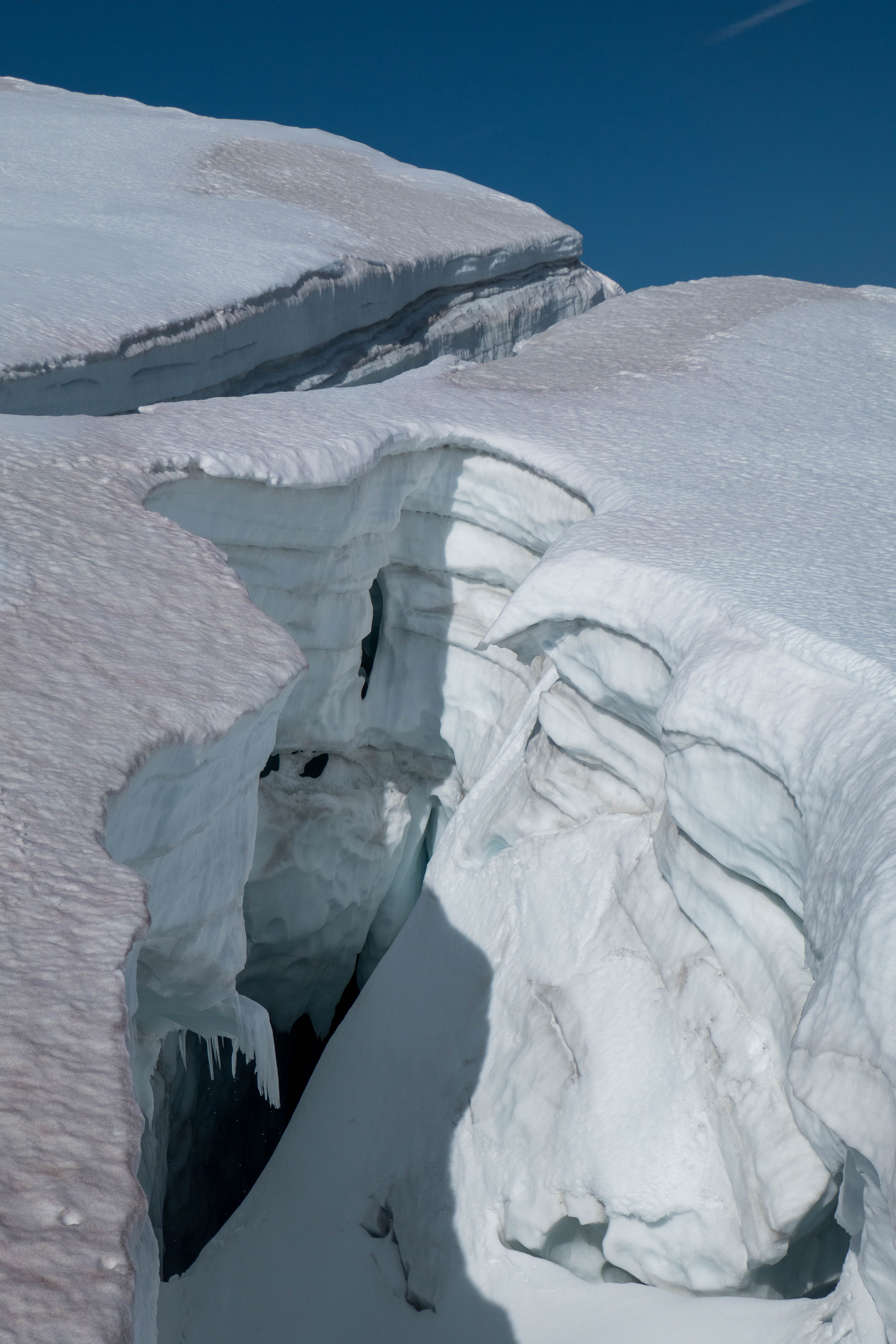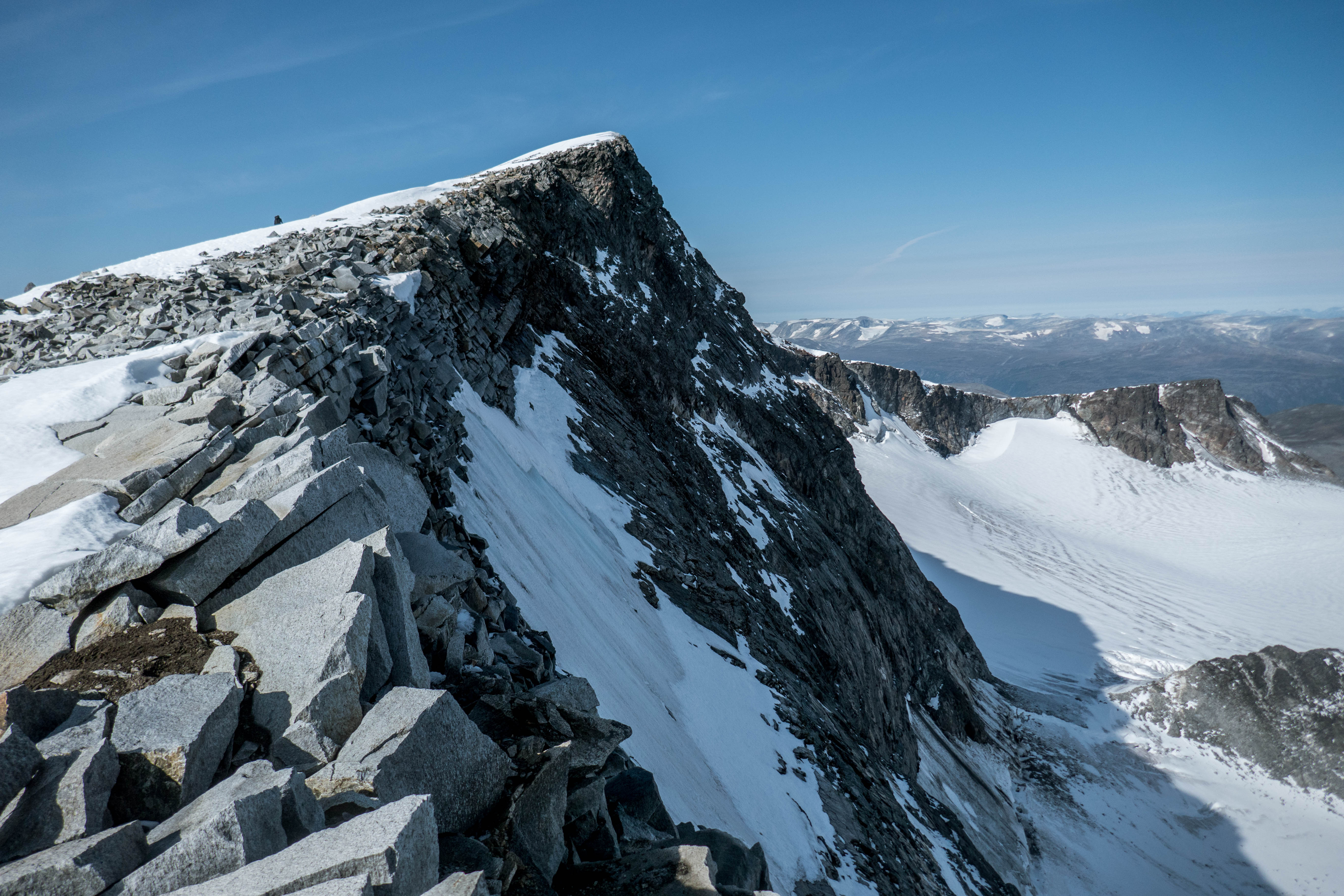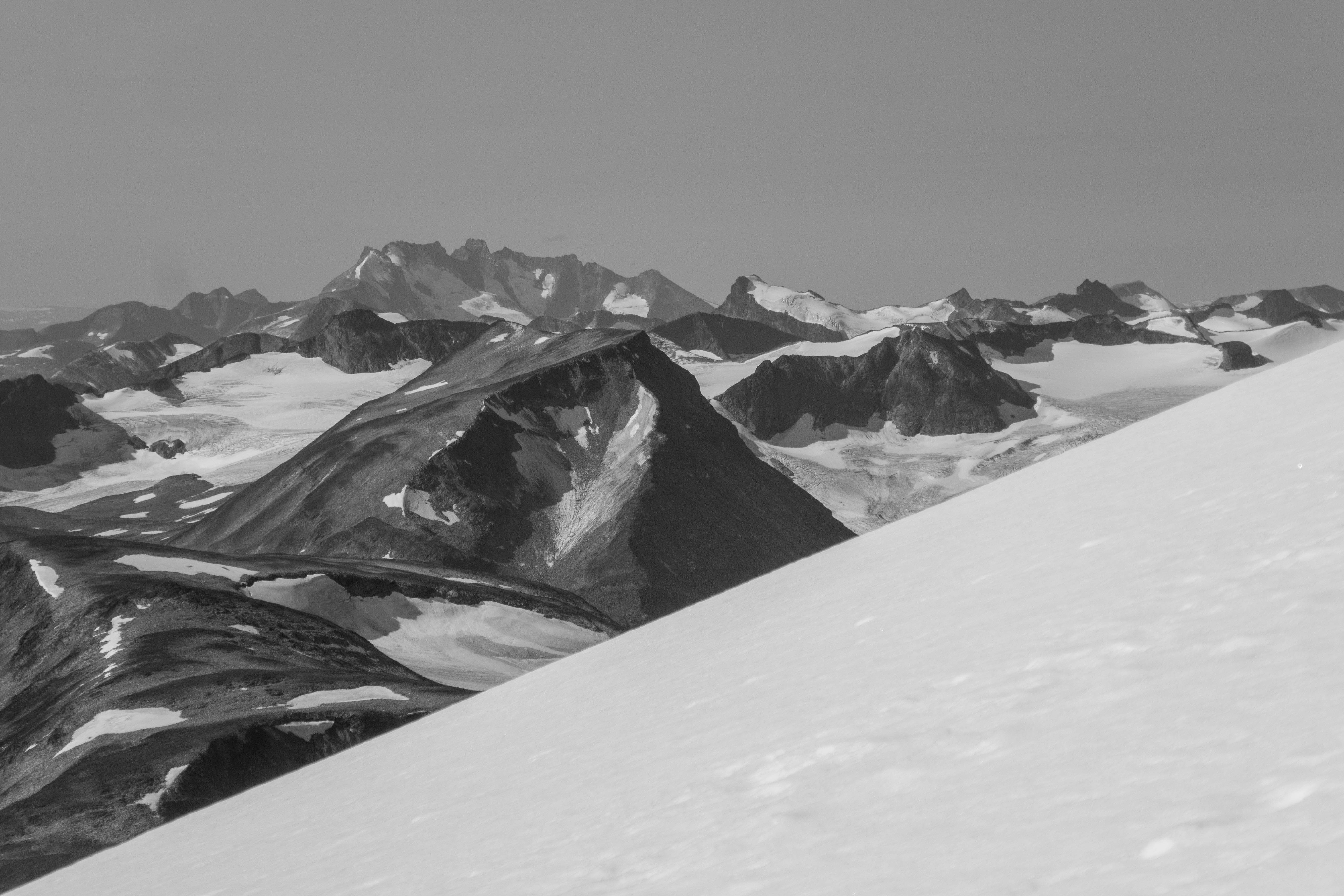 Op de bijna ijsvrije top zelf wordt plotseling Grotbrean zichtbaar. De twee armen van die gletsjer beginnen pal onder de top, waar de sneeuw veilig in de schaduw van een tweehonderd meter hoge verticale afgrond ligt. Dat het ijs er zo mooi wit bij ligt komt door het verse laagje sneeuw dat een paar dagen eerder was gevallen en in de late augustuszon maar moeizaam smolt.