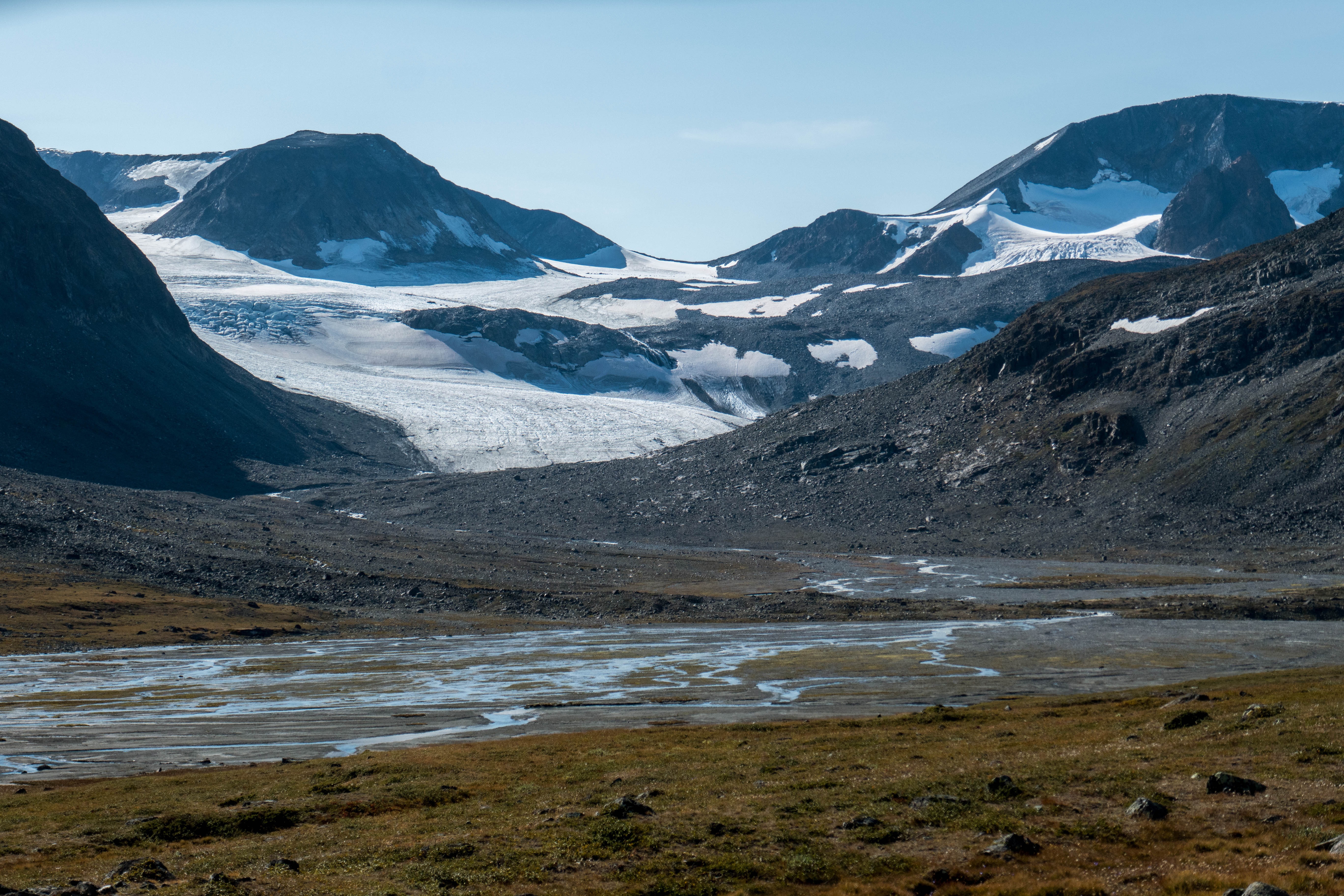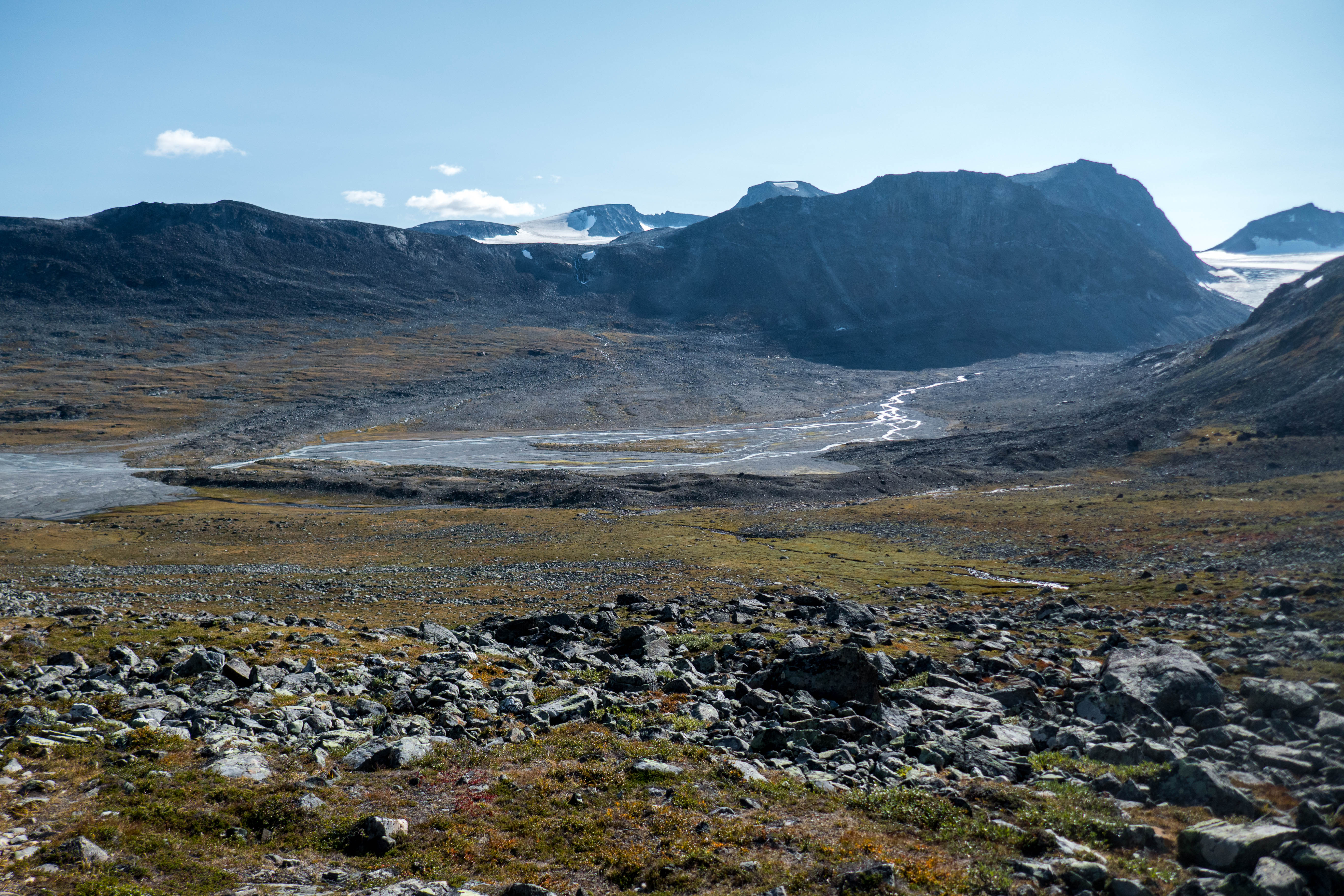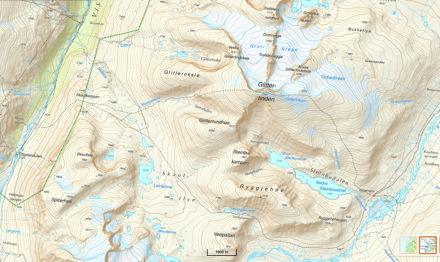 Beneden, aan de oostkant, ligt Glitterheim. Het is de makkelijkste uitvalsbasis om naar de top te lopen, omdat het met 1400 relatief hoog ligt. Glitterheim ligt in het Veodalen, een breed dal met veel rendieren. Aan het einde van het dal ligt de Veobrean. Of beter gezegd, lag. De gletsjer bestaat nog wel, maar is een heel eind teruggetrokken. Dat zie je ter plekke perfect aan de halfronde eindmoraine die als een stenige band door het dal loopt.