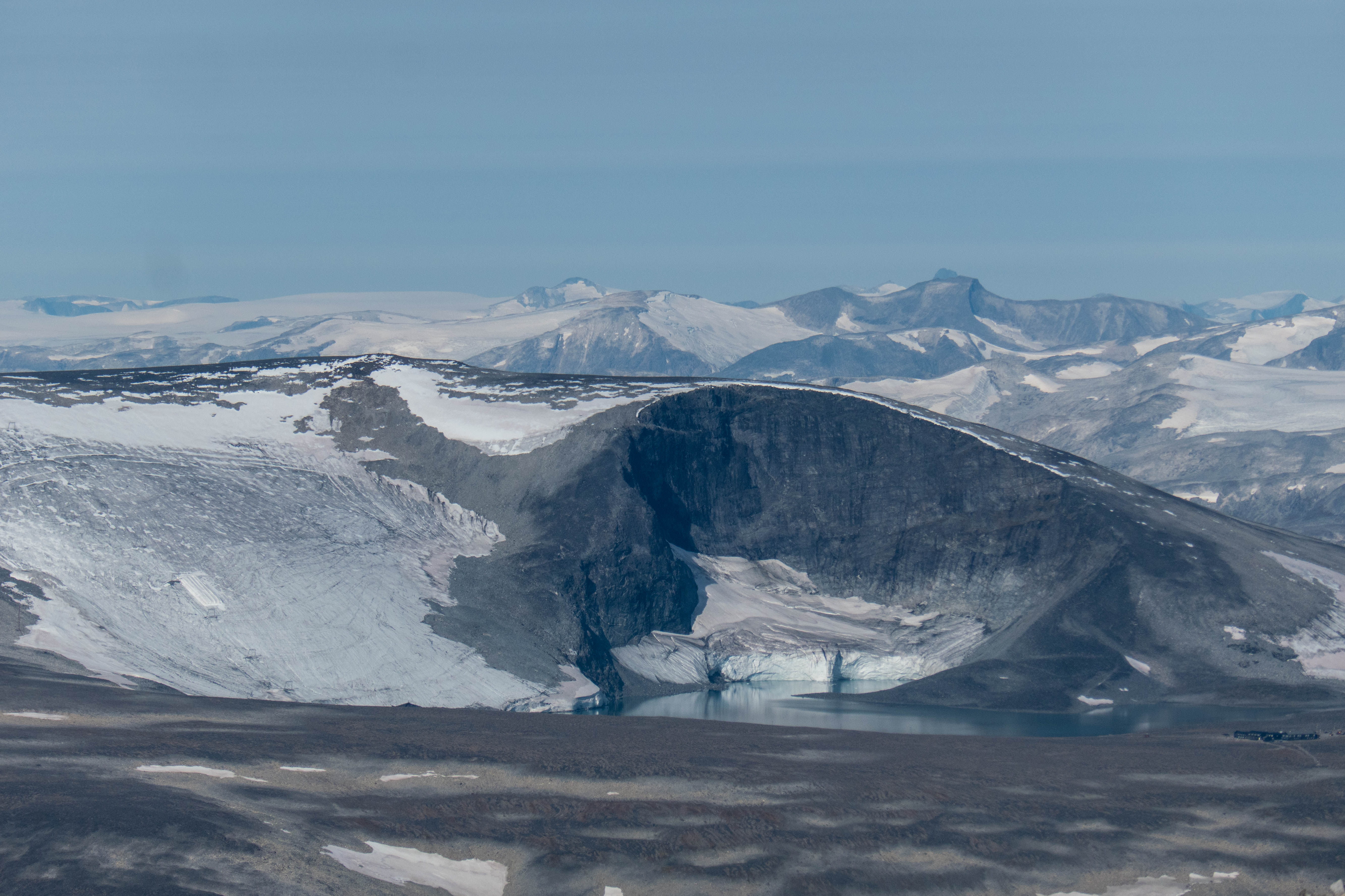 Iets ander standpunt, maar het idee is duidelijk:Zelfs een paar jaar geleden lag er nog een mooi kapje op de berg. Inmiddels bestaat de top bijna geheel uit rots en is Galdhøppigen het onbewiste hoogtepunt van Noorwegen. Die meet 2469 meter, Glittertinden 2452. Wie de wandeling naar Glittertinden vanaf de westkant (het Spiterstulen-hotel) begint, kan onderweg langdurig genieten van Galdhøppigen. De top van Glittertinden is onderweg nooit zichtbaar. Wel zichtbaar: Juvvasshytta en de gletsjer waar 's zomers op wordt geskied (maar op de foto niet, want er ligt geen sneeuw meer op het grijze ijs). Rechts ervan een meertje met kalvende gletsjer, verder naar achteren Jostedalsbreen.