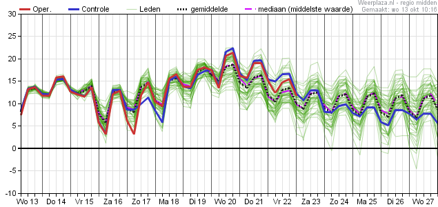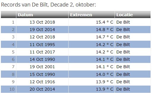 Ik laat even de top-10 notering zien van hoogste minimumtemperaturen in de 2e decade van oktober. Ben benieuwd. Een top-10 notering voor wat betreft de maximumtemperatuur zal moeilijker worden.