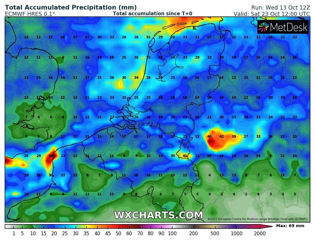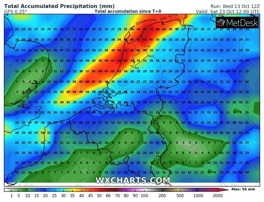 Gfs is flink nat voor de komende 10 dagen. Aan de kust zal rond de 50 mm gaan vallen.