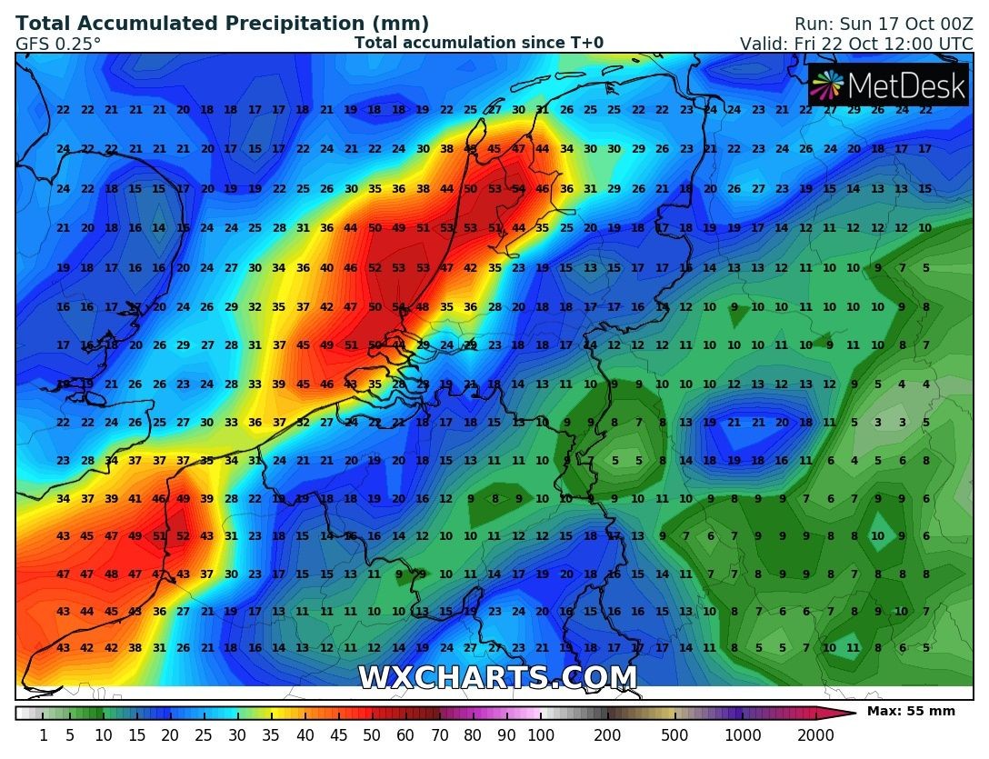 De komende 5 dagen valt er in nw Nederland plaatselijk 40 tot 60 mm neerslag.