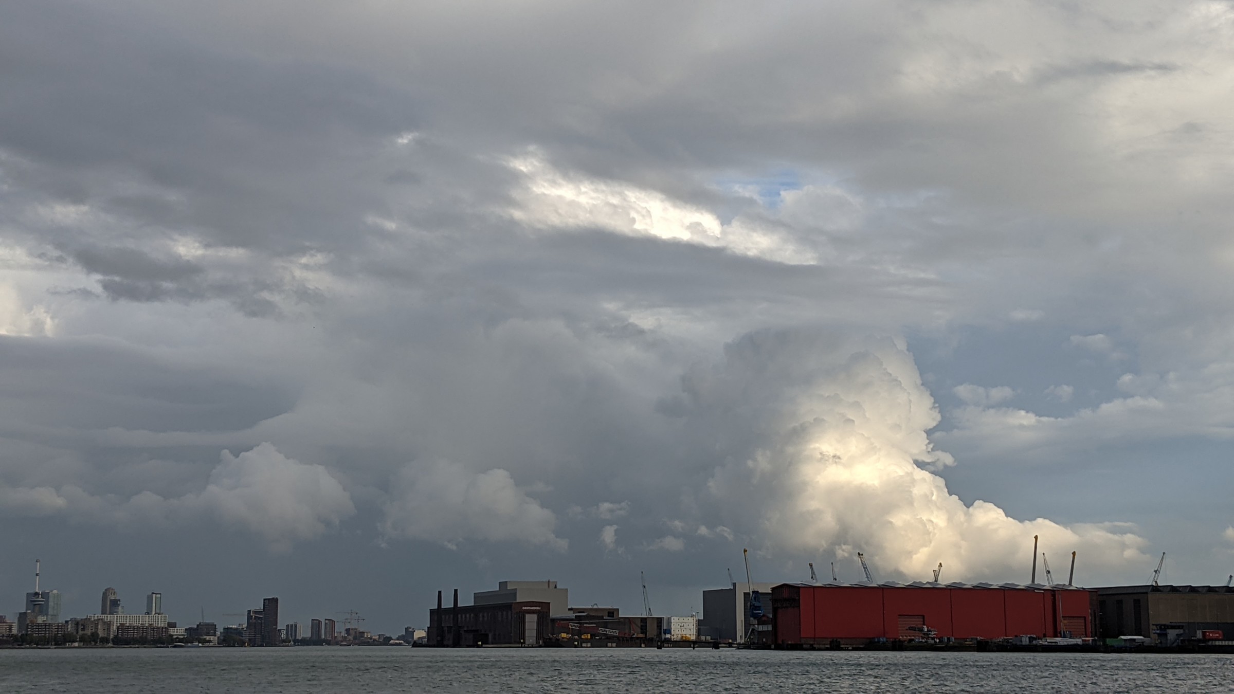 Verbaasd mij niets, ik was aan het kitesurfen op de Maasvlakte (tijdens de buien van het water af). Maar je zag gewoon dat buienwolken op zijn kant draaien en veranderden in een soort mini LP supercell qua structuur.