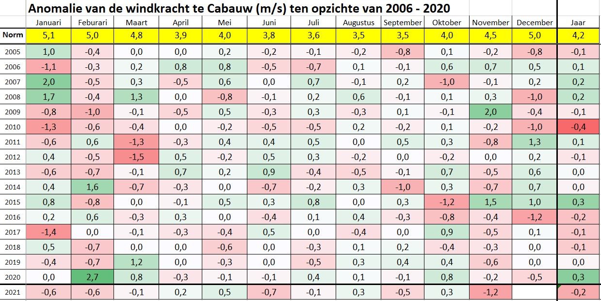 2021 blijkt voor de windkracht tot nog toe een matig jaar, net zoals 2016, 2017 en 2018 matige jaren waren. 2020 was een goed windjaar, wat helemaal te danken is aan februari. Ook 2015 was een goed windjaar.