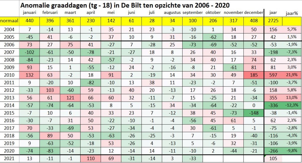 Ik heb voor elke maand uitgerekend hoeveel het aantal Graaddagen afweek van de normaal. Voor de normalen ben ik uitgegaan van de periode 2006 - 2020; een periode van 30 jaar geeft in tijden van klimaatverandering immers geen goed beeld. Dat ziet er als volgt uit:
