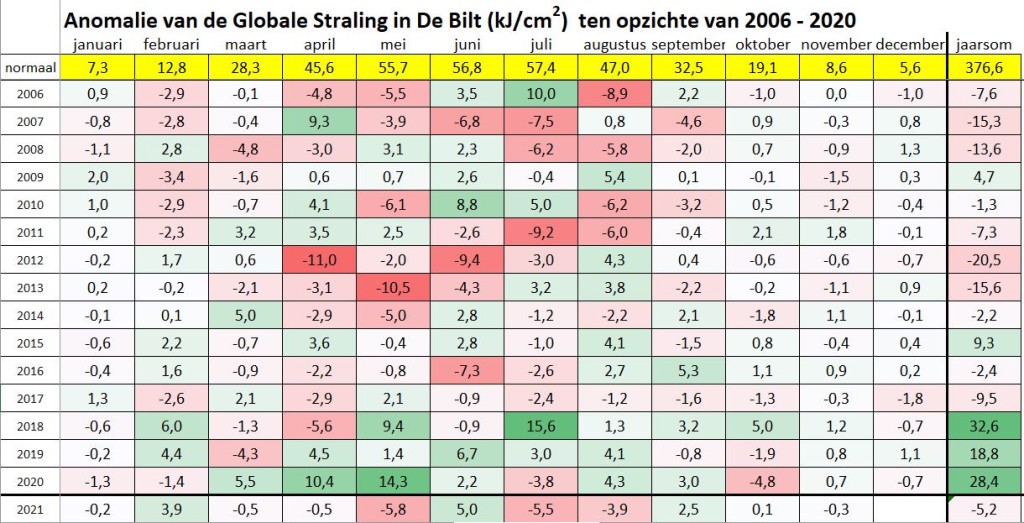 Kijken we naar de hoeveelheid zon, of beter naar de inkomende (globale) straling. In groene maanden was er meer inkomende straling dan normaal, dus meer opbrengst van zonnepanelen.