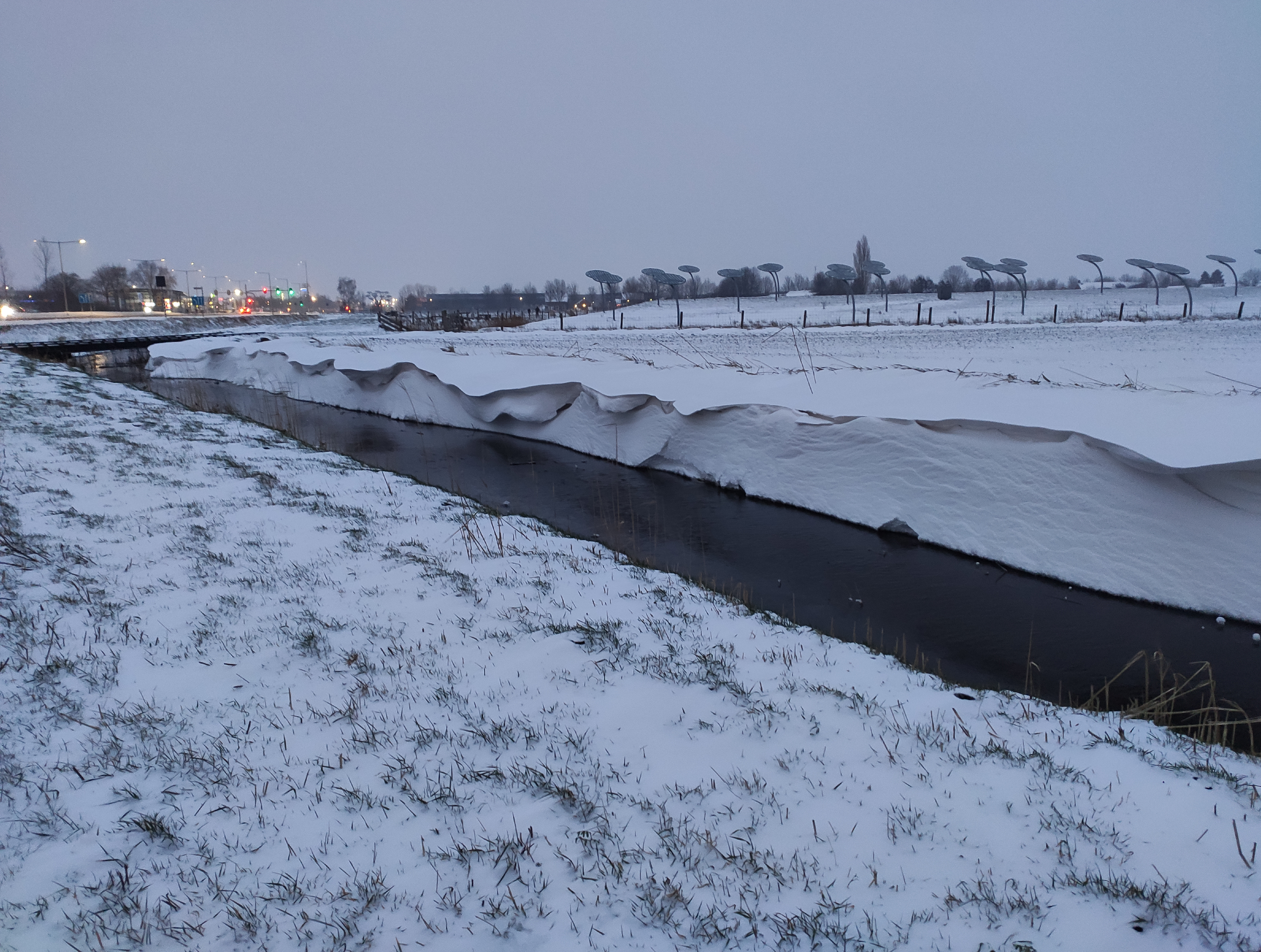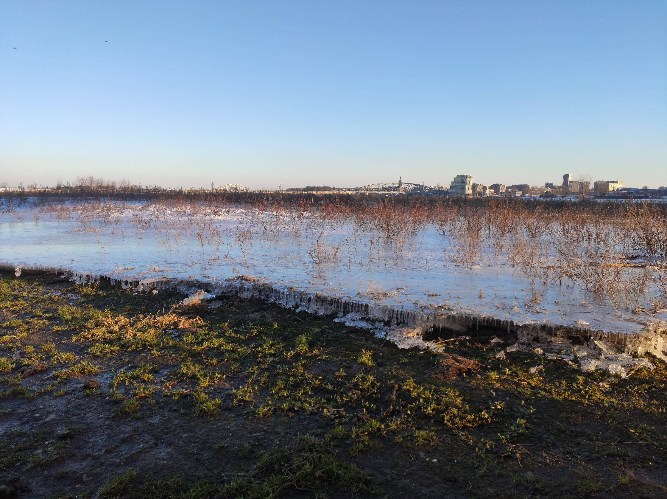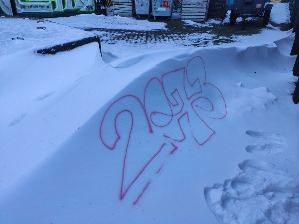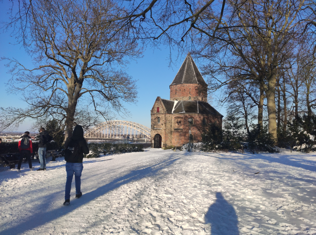 Een mooi uitzicht op het Valkhof, ijsvloer op pootjes langs de Waal dankzij het terugtrekkende hoogwater. Een graffiti schrijver die sneeuwduinen ook leuk vond zo te zien.