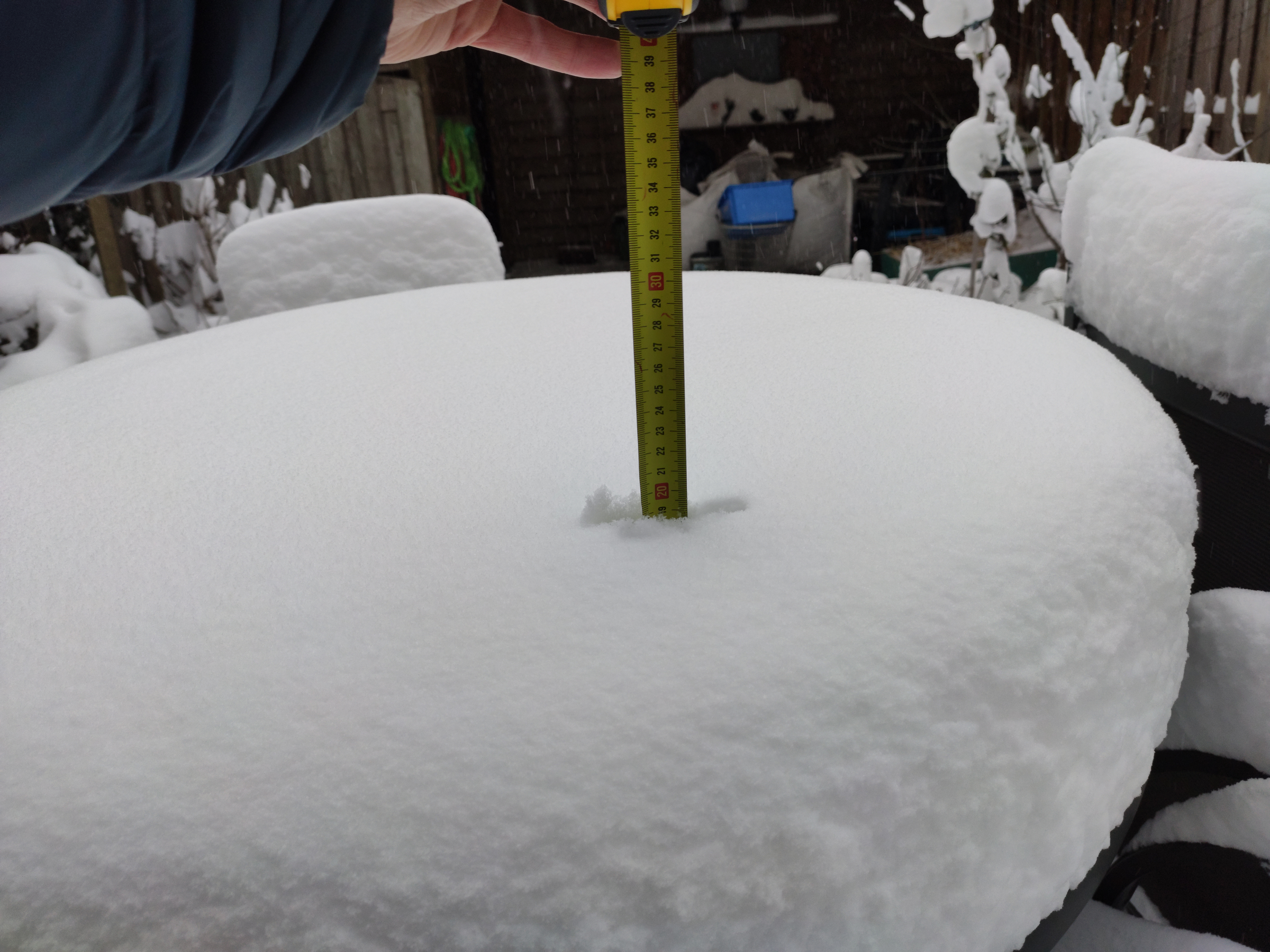 Schitterende sneeuwduinen, een pak van uiteindelijk 25 cm dik (helaas geen foto van). Wel toen het ~20 cm dik was op de tuintafel.