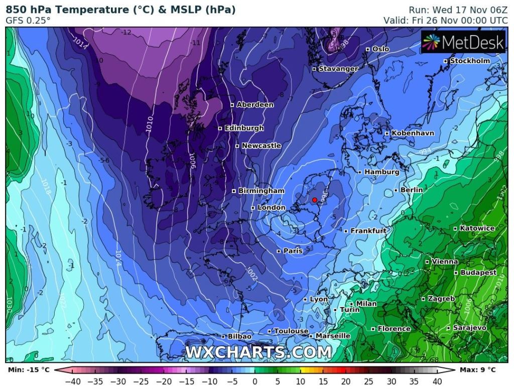 De weerkaart die de 6u run van GFS vandaag berekent, ook voor 26 november, is voor de sneeuwliefhebbers welhaast de meest ideale die voorgeschoteld kan worden in deze tijd van het jaar. Met een straffe noordenwind wordt de meest koude lucht weliswaar over de UK naar het zuiden gevoerd, maar via een omweggetje is een deel van deze koude lucht eerder al toch boven de Benelux gearriveerd. Een strategisch gelegen lagedrukgebiedje ligt voor de Zuid-Hollandse kust en zorgt ervoor de de wind bij ons zwak en overwegend zuidelijk is (en dus niet van zee waait), waardoor door doorvallende neerslag de grenslaag, ook bij 'slechts' -4 à -5 graden op 850 hPa, voldoende afkoelt om de neerslag al spoedig in sneeuw te laten overgaan. En hoe! GFS berekent op basis van deze weerkaart, dat er in Bennekom 10 cm sneeuw gaat vallen! In feite valt er volgens deze berekening nóg meer sneeuw, maar een deel daarvan smelt natuurlijk weg, terwijl hij valt.