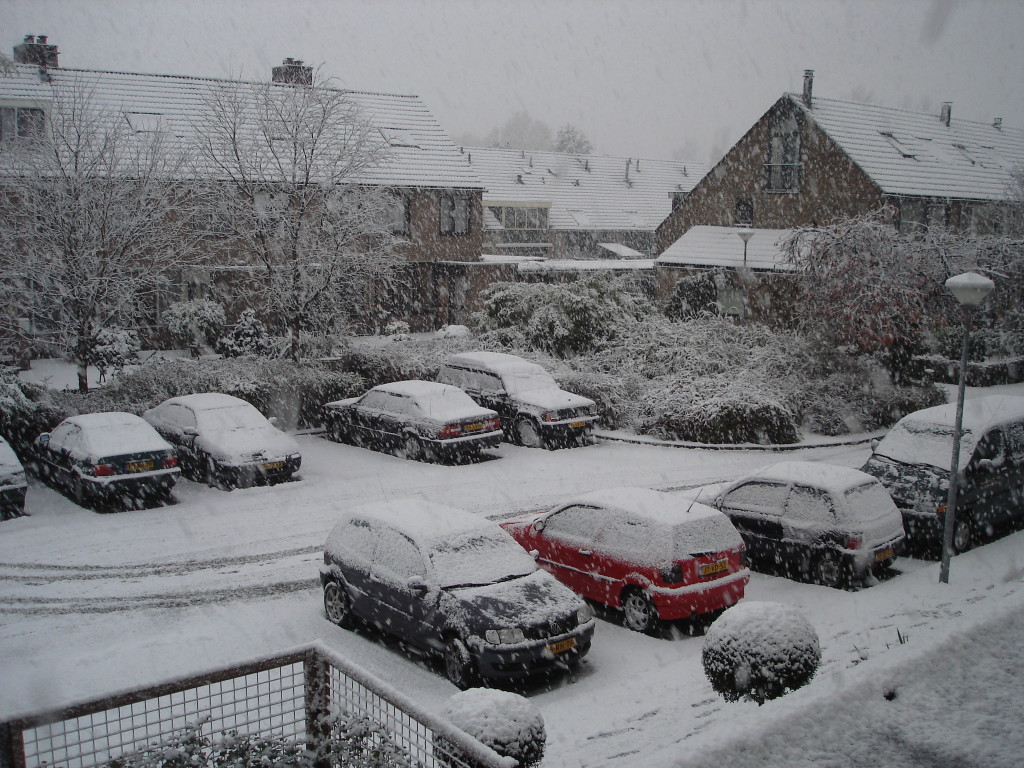 Maar... dat wordt een heel ander verhaal als de wind een stuk zwakker is, of aflandig is. Een 850 hPa temperatuur van -4 à -5 graden is dan al ruim voldoende om het nul-graden niveau bij flink doorvallende neerslag tot (nabij) het aardoppervlak te krijgen en de neerslag, die dan vaak als regen, of een mix van regen en natte sneeuw begint, in sneeuw te laten overgaan. Het meest beruchte (beroemde) voorbeeld uit deze eeuw is wel 25 en 26 november 2005. De foto heb ik zelf geschoten op 26 november van dat jaar.