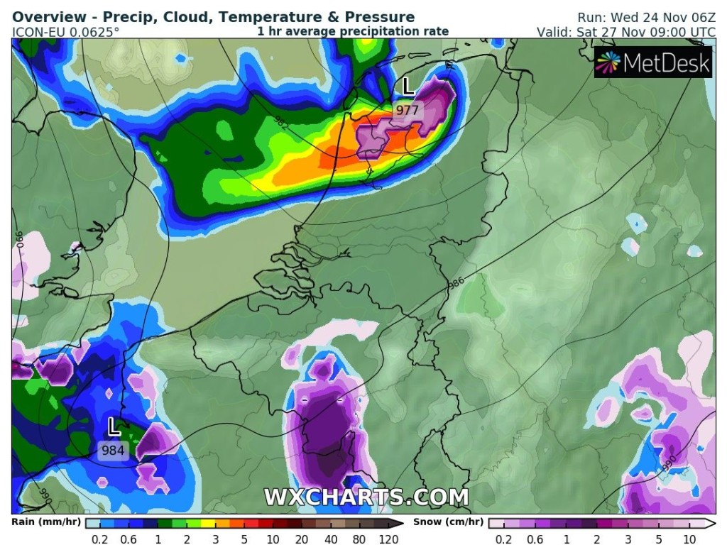 Positie van de neerslag gaat natuurlijk nog wel een paar keer veranderen, maar met stevige neerslag en daardoor neerslagafkoeling zijn er leuke dingen mogelijk.