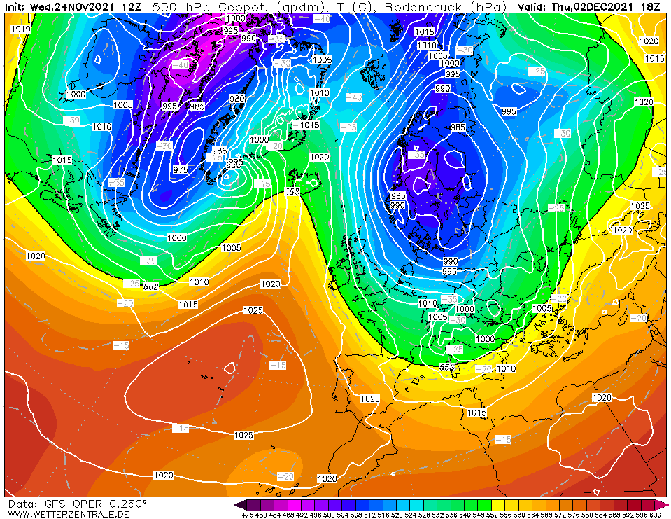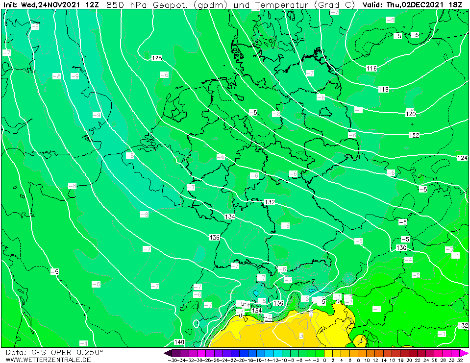 Een vrij diepe noordweststroming brengt maritiem arctische lucht met zich mee. T850 dalen rond -6°C à -8°C.
