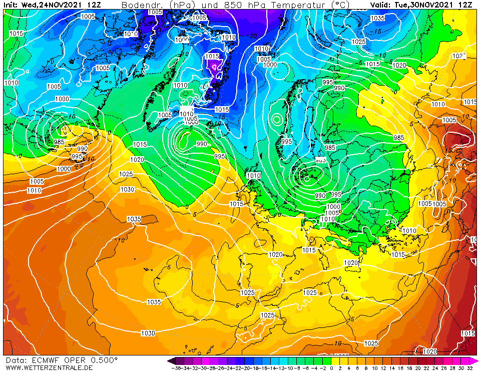 We zitten in de koude lucht, depressie bij Ijsland lijkt een vrij zuidelijke baan te gaan volgen. Daarachter nieuwe hogedrukimpulsen?