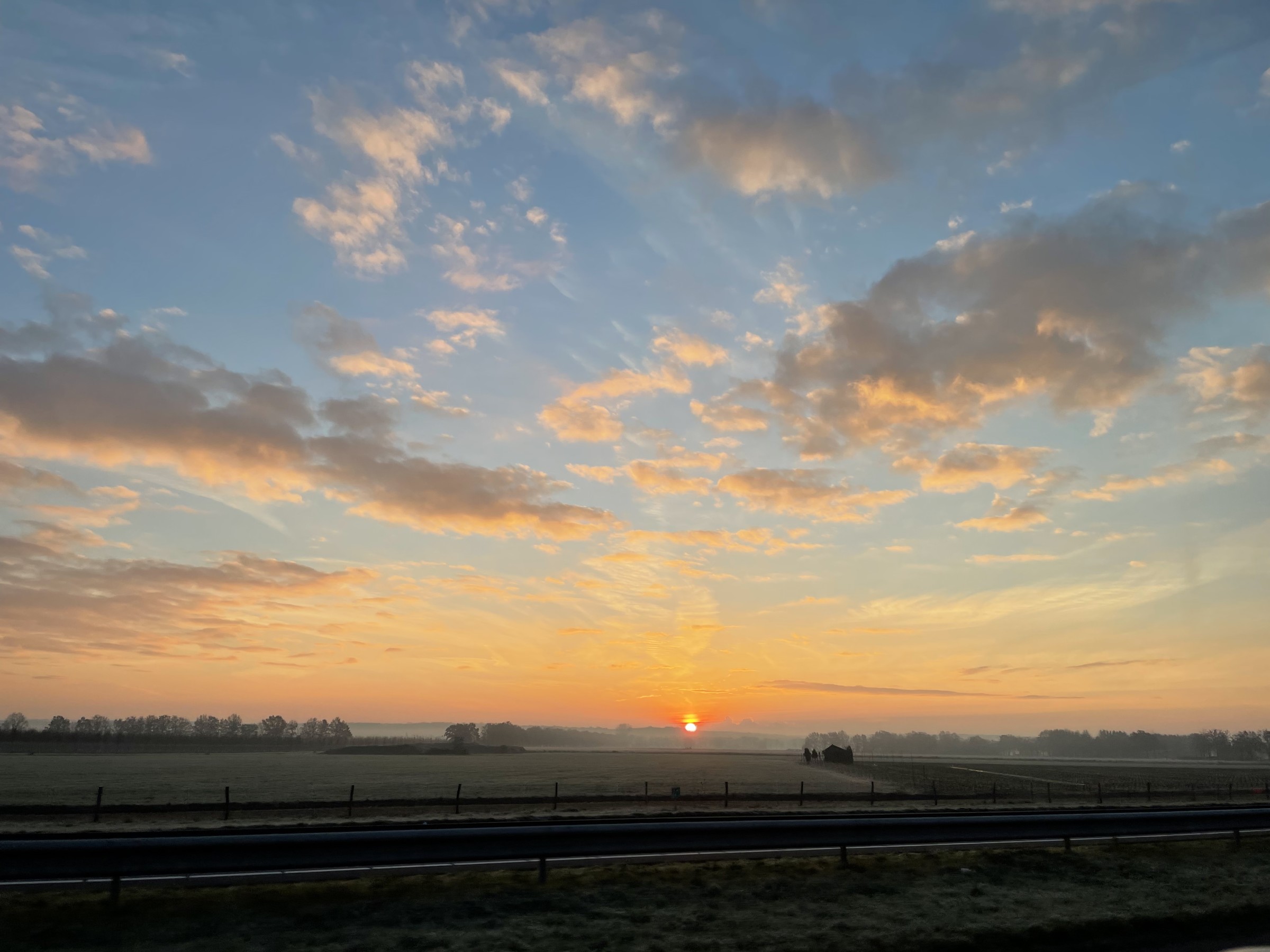 Thuis vertrokken met +5°C en zwaar bewolkt. Inmiddels -2°C en het landschap licht berijpt. Een mooie rit zo voor het werk richting zuid Limburg.