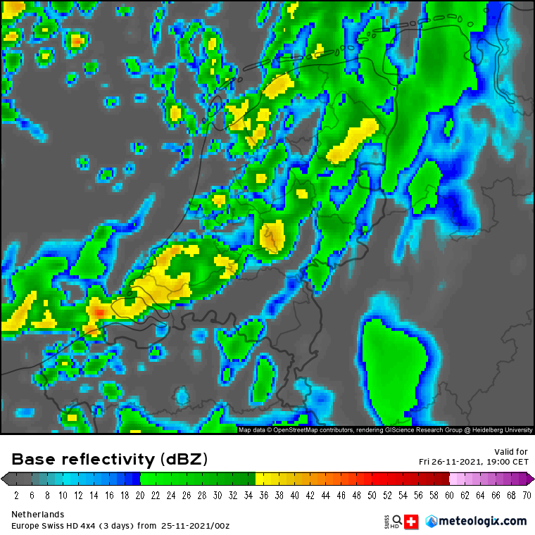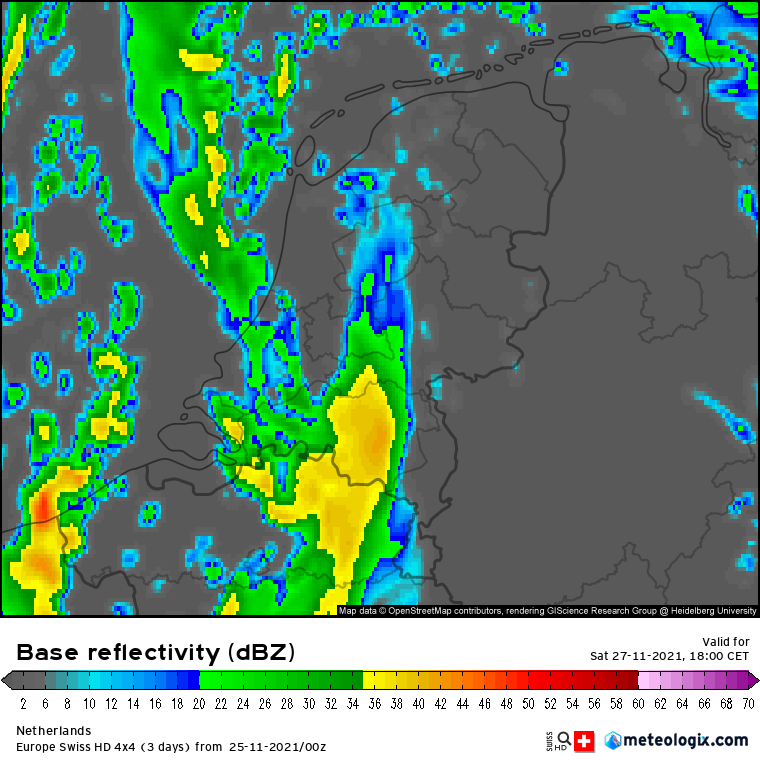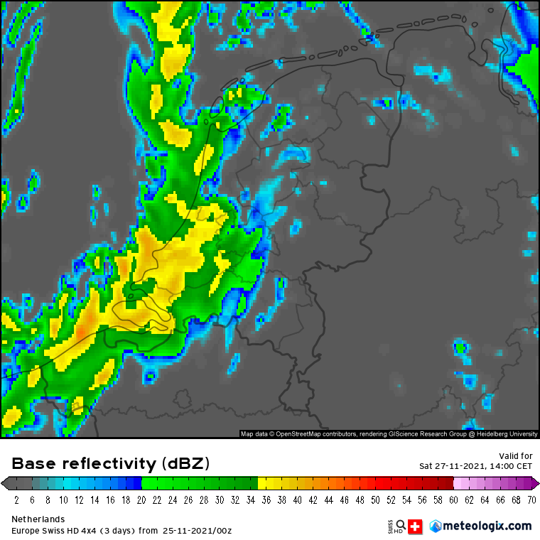 Maar natte sneeuw (zonder accumulatie) zal er echt wel gaan vallen op sommige plaatsen. Kijk alleen al naar de neerslagintensiteit van de (geclusterde) buien, die ligt vaak zelfs rond of boven de 5 mm/h. Dan kan isothermie een serieuze rol gaan spelen en kan de sneeuwgrens zomaar 200 of 300 meter zakken. Dat zou voldoende moeten zijn voor natte sneeuwvlokken, ook in de lager gelegen gebieden.