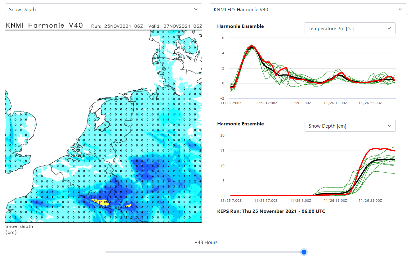 Het model berekent een vrij hoge neerslagintensiteit gedurende meerdere uren in dat gebied. Neem daarbij de afkoelende bovenlucht en de lage temperaturen nabij de grond in hoger gelegen delen. Misschien dat in de dalen isothermie ook nog voor verrassingen kan zorgen als de hoge neerslagintensiteit maar lang genoeg aanhoudt. Het Harmonie-EPS gaat gemiddeld voor meer dan 10cm in Zuidoost-België. De eerste keer dit winterseizoen dat ik deze waarden zie in dat model
