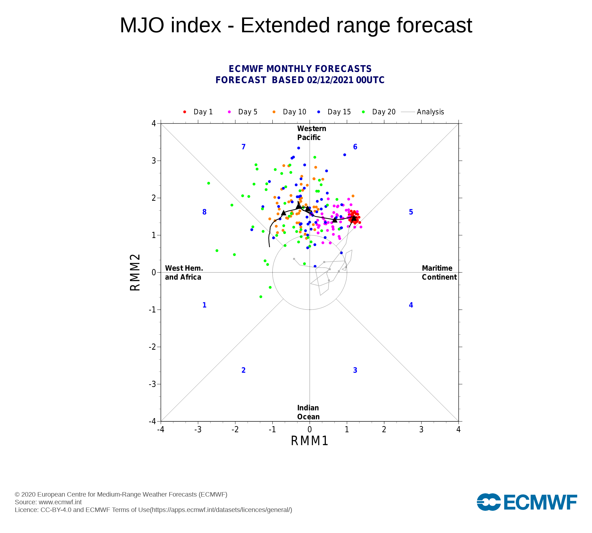 Afbeelding: Verwachting en verloop van de MJO volgens EC46.