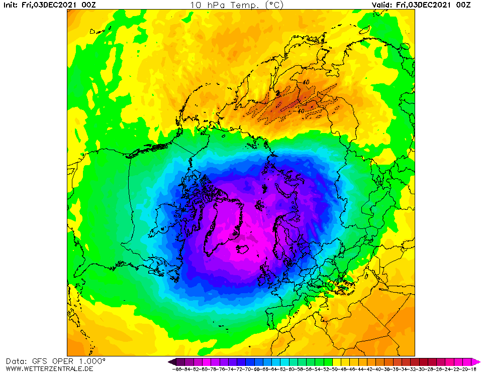 Afbeelding: De temperaturen op 10hPa tonen een grote bel aan koude lucht boven de Noordpool.