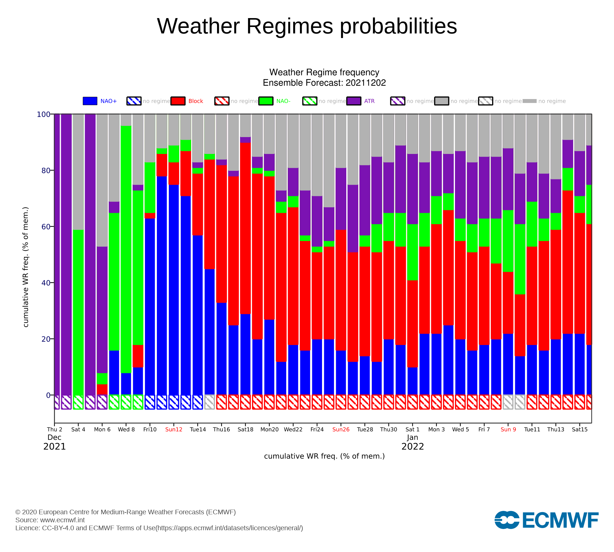 Vanaf half december zien we dan een duidelijke verandering optreden. De kans op een positieve NAO neemt af naar zo’n 10 tot 20 procent rond 20 december en blijft daarna relatief laag. De kans op een geblokkeerd patroon boven Europa (rode kleur) neemt duidelijk toe en wordt zo’n 30 tot 50 procent. Vanaf de Kerstdagen neemt de kans op een blokkade op de Atlantische Oceaan ook iets toe. Kijk je naar de clusterscenario’s van gisterenavond, dan zie je voor over twee weken inderdaad twee clusters (cluster 1 & 3) met een geblokkeerd patroon boven Europa en één cluster met een westcirculatie.