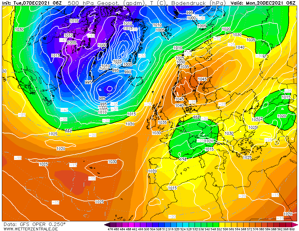 Kortom, het zou me niet verbazen als we op de lange termijn steeds meer oplossingen gaan zien die met een aflandige wind komen en (stralings)vorst laat zien. Bij dat soort kaarten is het ook beter om naar de temperaturen aan de grond te kijken dan bijvoorbeeld op 1,5 kilometer hoogte. Zo geeft GFS voor 23 december temperaturen die in West-Rusland op 1.500 meter hoogte meer dan 12 graden boven normaal liggen, terwijl het er aan de grond afkoelt naar -15 tot -20 graden.