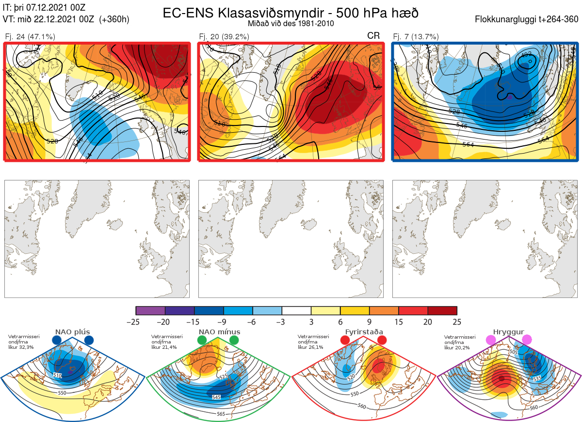 De laatste runs van GFS tonen op de lange termijn telkens hogedrukgebieden boven het Europese continent die noord- tot noordoostelijk willen trekken, ook de laatste uitvoer (06z). Kijk je naar de clusterscenario's van het EPS, dan zie je voor 22 december ook een overtuigende meerderheid die gaat voor hogedrukgebieden in onze omgeving of ten noord(oost)en van ons. Slechts iets minder dan 15% laat een voorkeur voor een westcirculatie zien. Er zijn (voorlopig) weinig leden die echte transportkoude voorzien, maar de kansen op vorst nemen hierdoor wel duidelijk toe.
