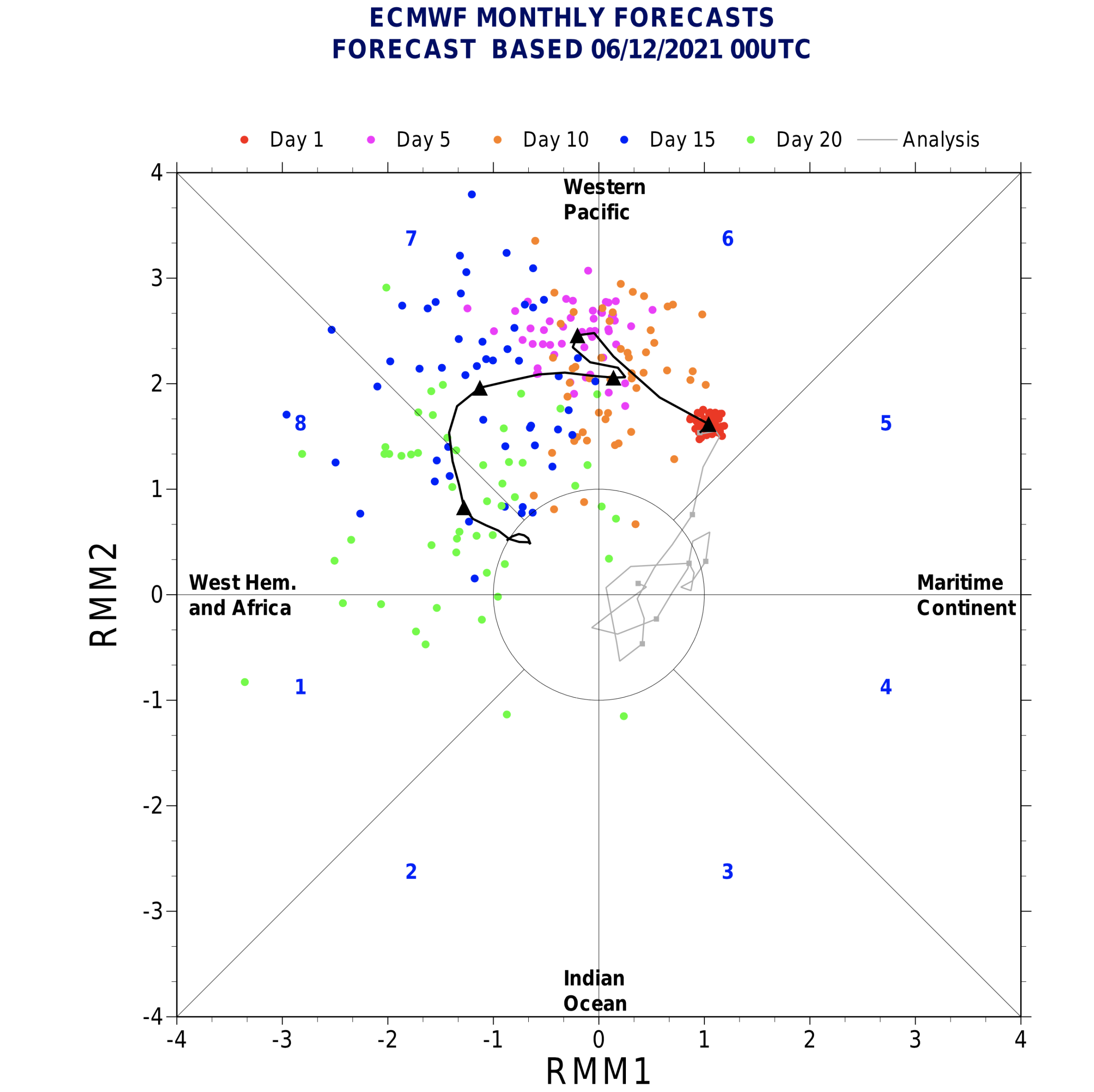 "Wat ook interessant is, is dat de MJO, de golfbeweging in de buienactiviteit rond de evenaar op de Indische en de Grote Oceaan, zijn fase 6 is ingegaan. Buiencomplexen hebben vanaf Indonesië het westelijke deel van de Grote Oceaan bereikt en trekken daar nu verder. Ze zijn behoorlijk actief. Deze buiengebieden kunnen de straalstroom daar, en op termijn ook die bij ons, weer in een golfbeweging brengen. Het is juist die ontwikkeling die, binnen de geleidelijke ombouw van de atmosfeer die we de komende dagen boven Europa zien, weleens voor verrassingen zou kunnen zorgen. En wel op zo’n manier dat het allemaal toch anders en sneller gaat dan we nu denken".